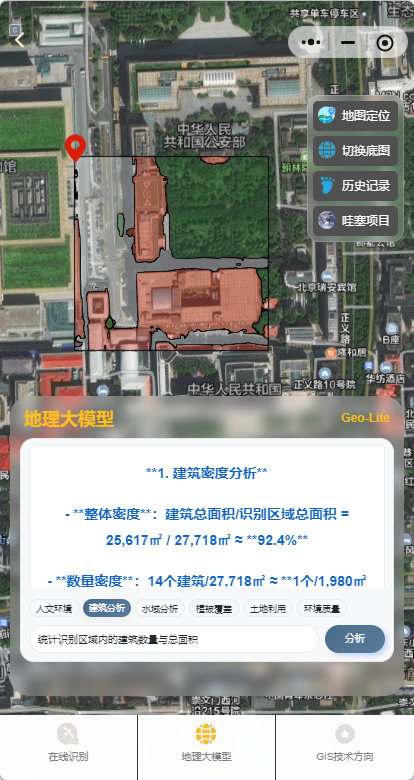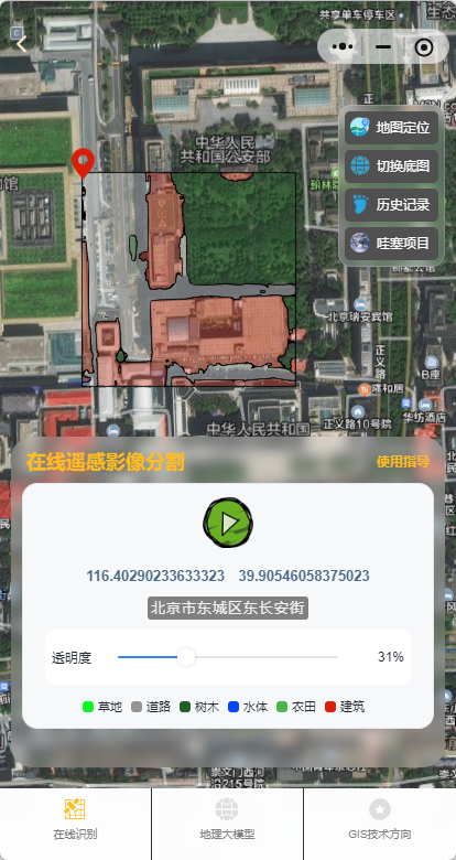 可以使用已经上线的微信小程序体验,目前集成了以上功能,由于微信小程序算力与磁盘大小有限,不支持上传本地遥感影像识别,但可以基于位置识别,可以识别全国90%的地方。