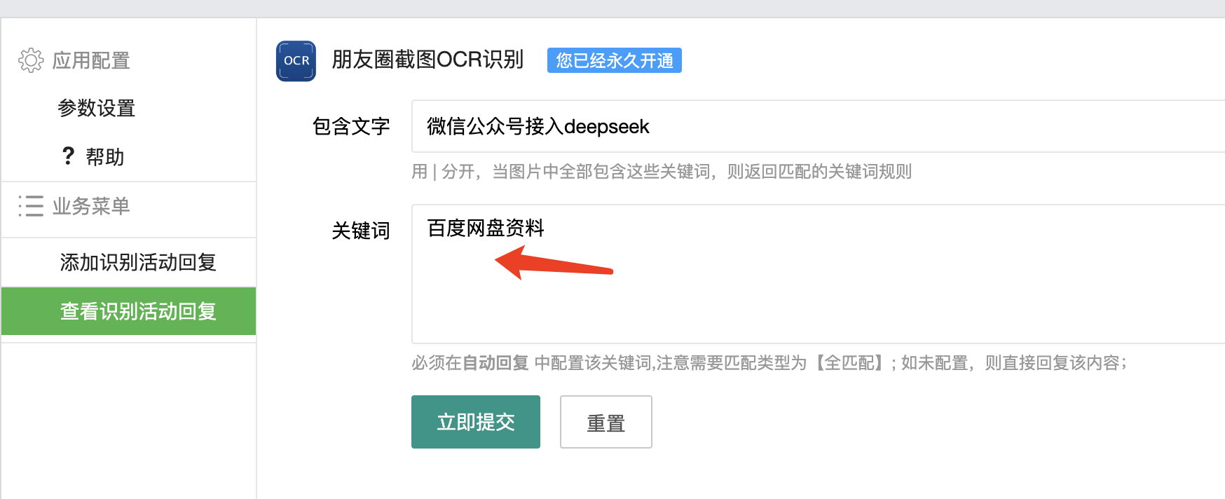 接下来我将揭秘这种功能是如何制作的,首先打开【微先生助手】,【朋友圈截图OCR识别】插件。这里可以看到,我们将【微信公众号接入deepseek】作为了图片检索的词汇,即当图片中包含这个词的时候,系统才会发放奖励,发放的奖励为【百度网盘资料】。