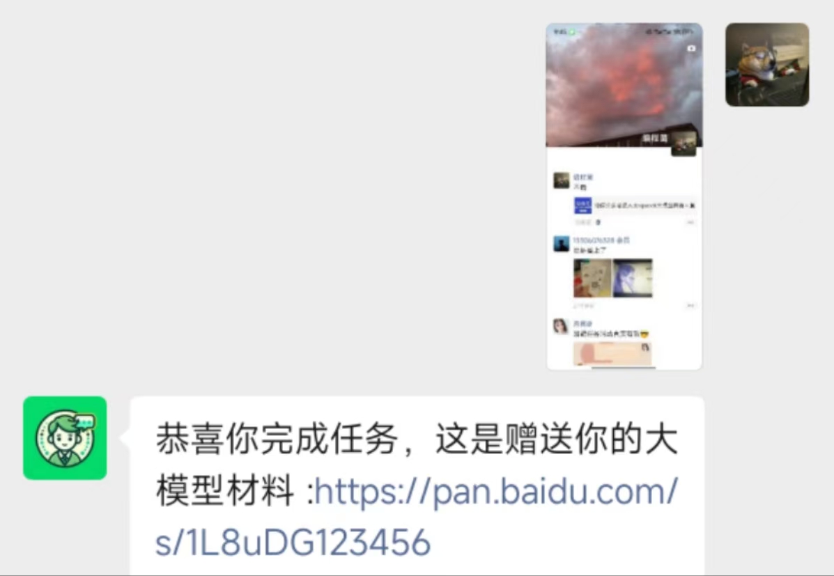 这里可以看到,我们将【微信公众号接入deepseek】作为了图片检索的词汇,即当图片中包含这个词的时候,系统才会发放奖励,发放的奖励为【百度网盘资料】。最后,朋友圈截图识别插件,可以和多个【微先生助手】的插件联动使用,比如朋友圈截图,触发【每日签到插件】的签到关键词;这种功能常用于引导粉丝分享公众号文章,从而增加粉丝阅读量,适当的奖励可以增加粉丝分享的积极性。因此,当粉丝发送如下的截图是,系统即可