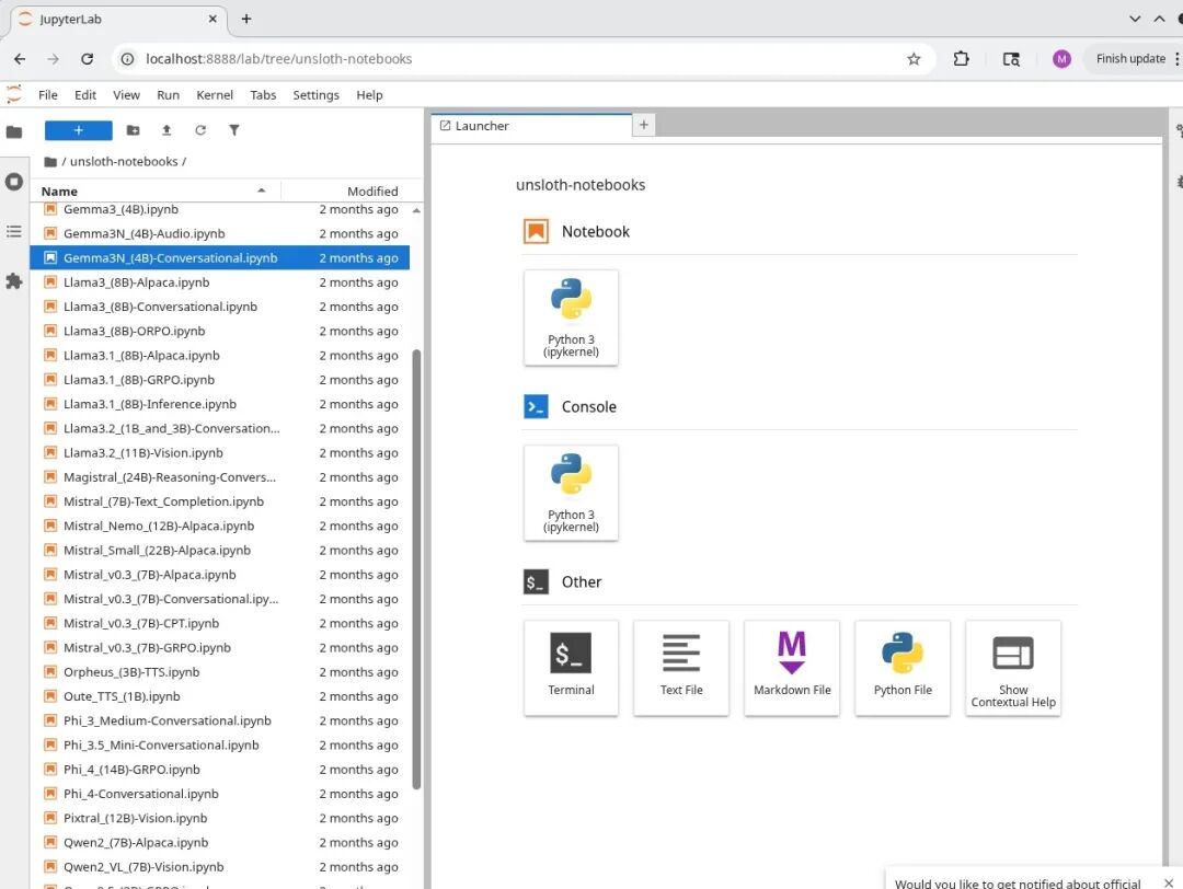 镜像里包含了所有 Unsloth 的示例 notebook,涵盖模型微调和强化学习等内容。数据通过 volume 挂载保存,容器删除后数据不会丢失。还支持 SSH 连接,方便使用自己熟悉的编辑器。
