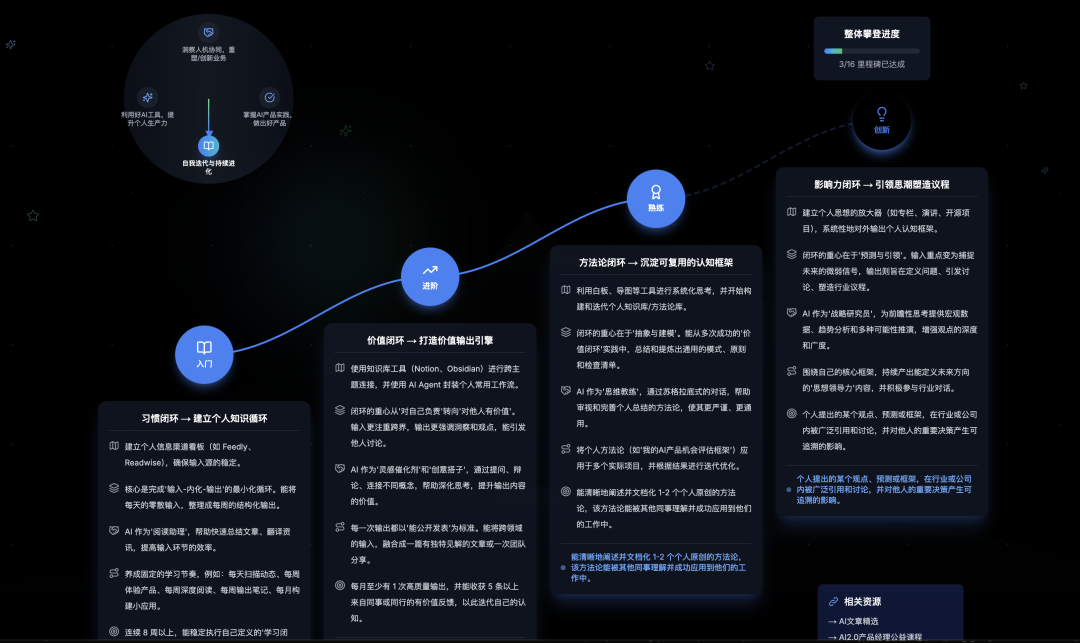 AI 带来的最大挑战,不是工具的变化,而是对我们认知框架的冲击。过去十年积累的很多产品经验,可能需要我们鼓起勇气,亲手打破它。这个方向的进阶路径强调建立持续的"输入-内化-输出"认知闭环: