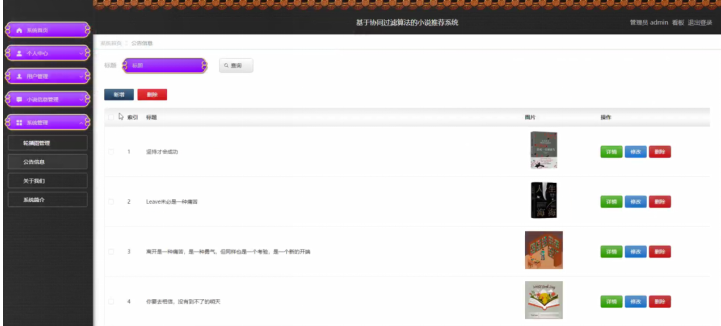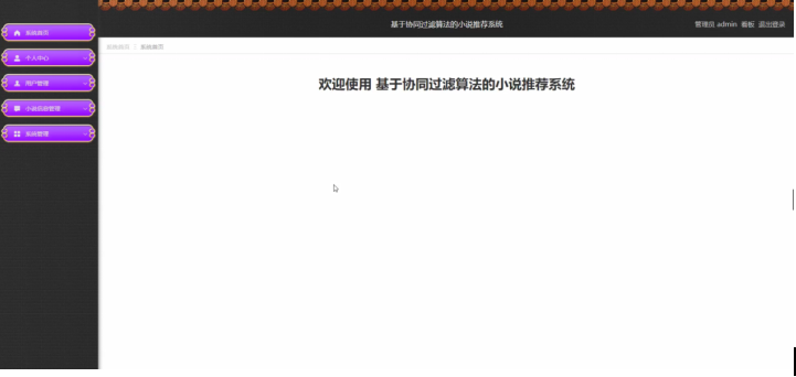 - 管理模块:基于 Django Admin 定制,支持小说数据、用户数据、推荐记录的可视化管理。
