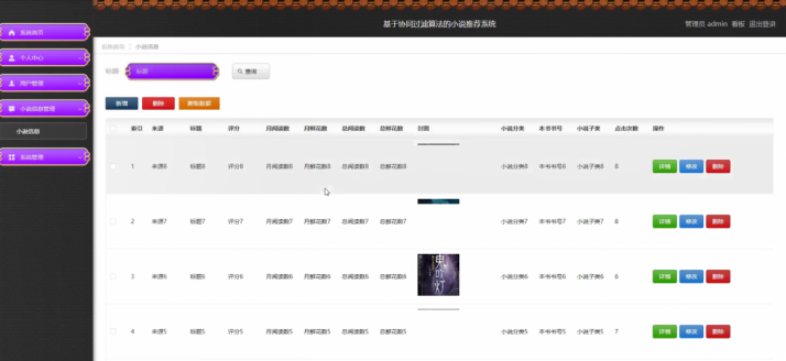 - 小说数据管理:查看爬虫获取的小说数据(来源、阅读量、评分),编辑错误信息(如 “书名错别字修正”),下架滞销小说;