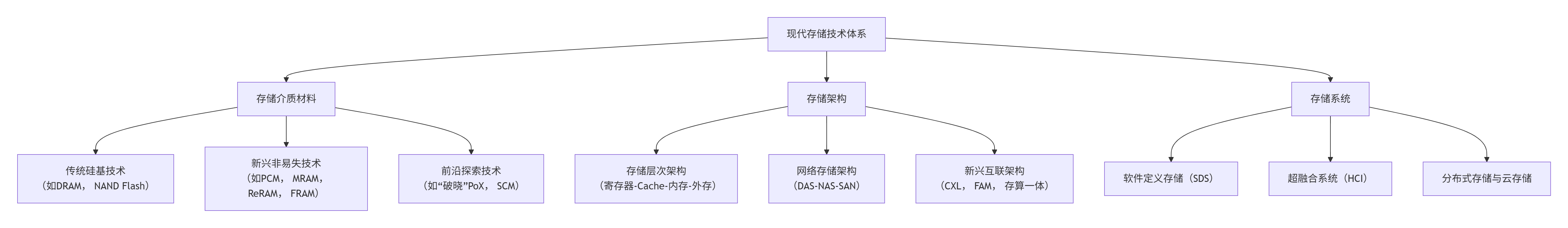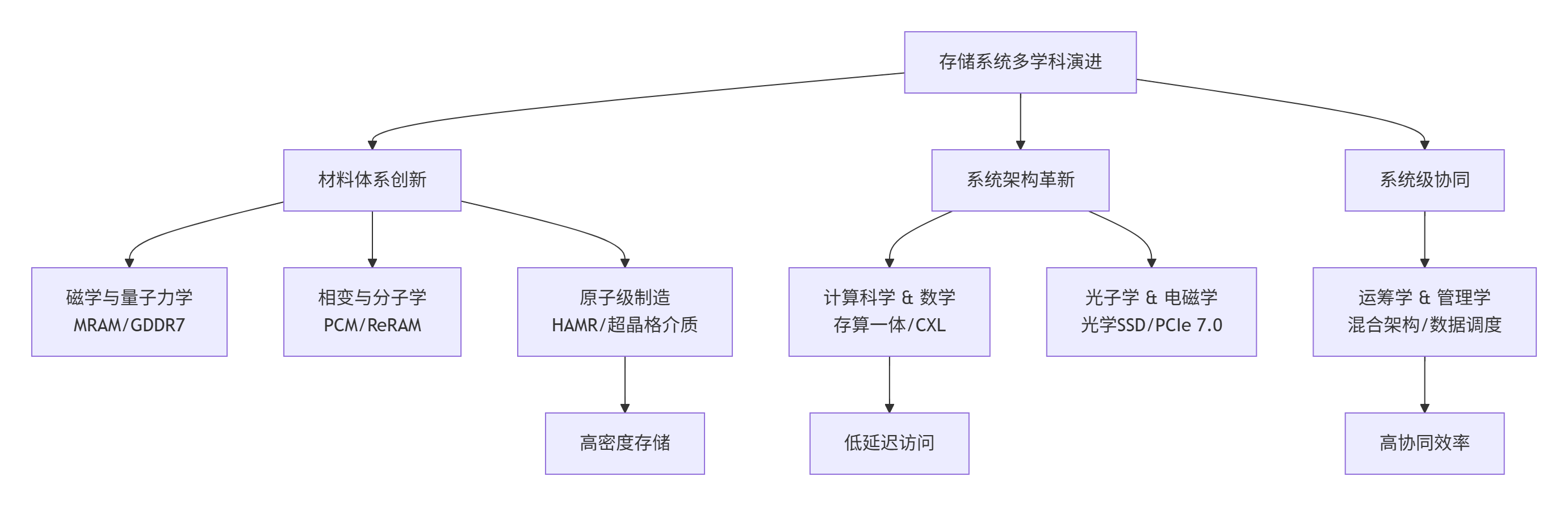 当前存储系统的演进,正是一场多学科深度交叉的协同革命。为了更直观地展示这场变革的全景,下图梳理了从底层材料到顶层架构,再到系统级协同的核心演进脉络: