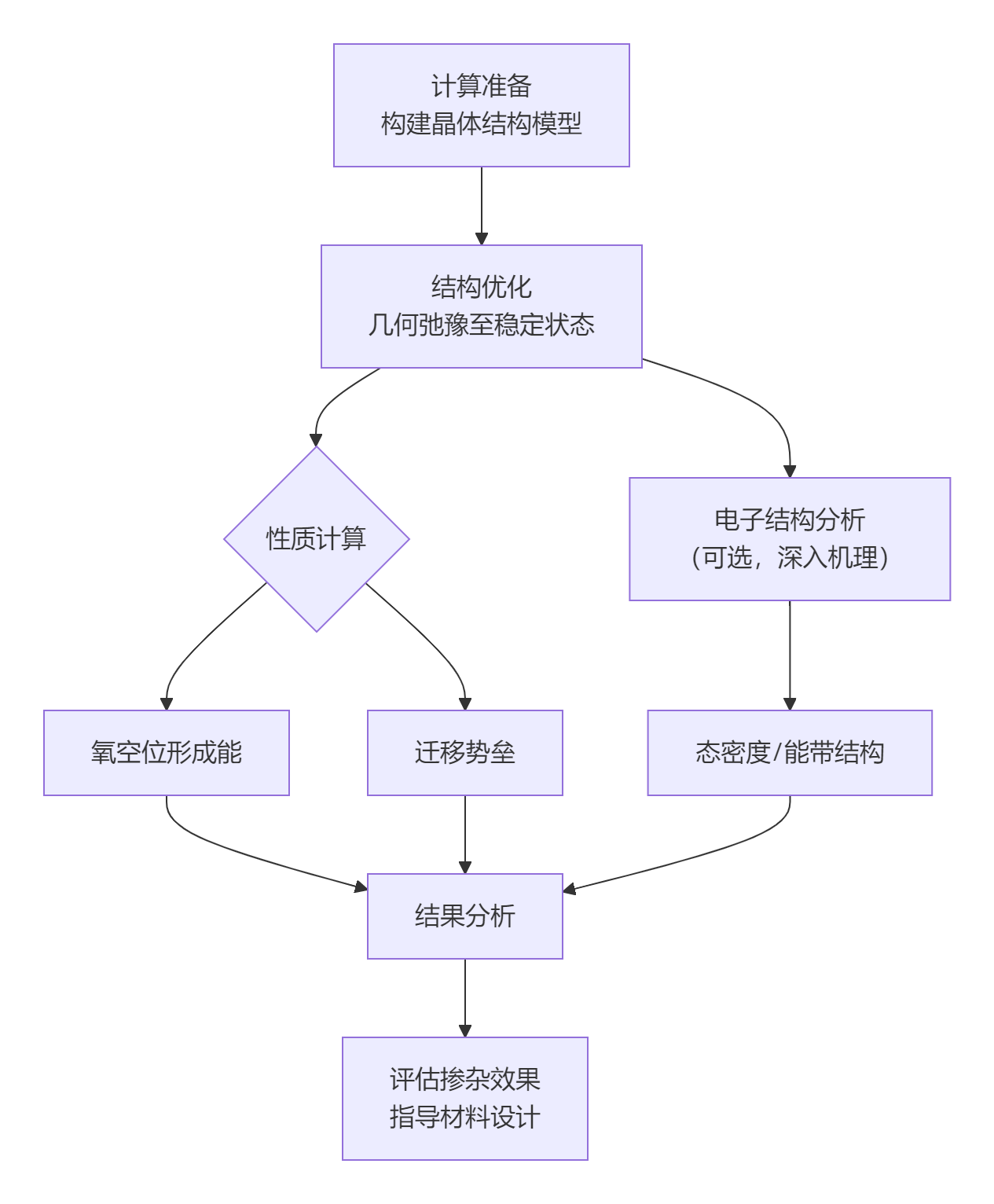 通过第一性原理计算预测掺杂对存储器介质层性质的影响,是设计高性能存储器的强大工具。下面这张图直观展示了核心的计算分析流程: