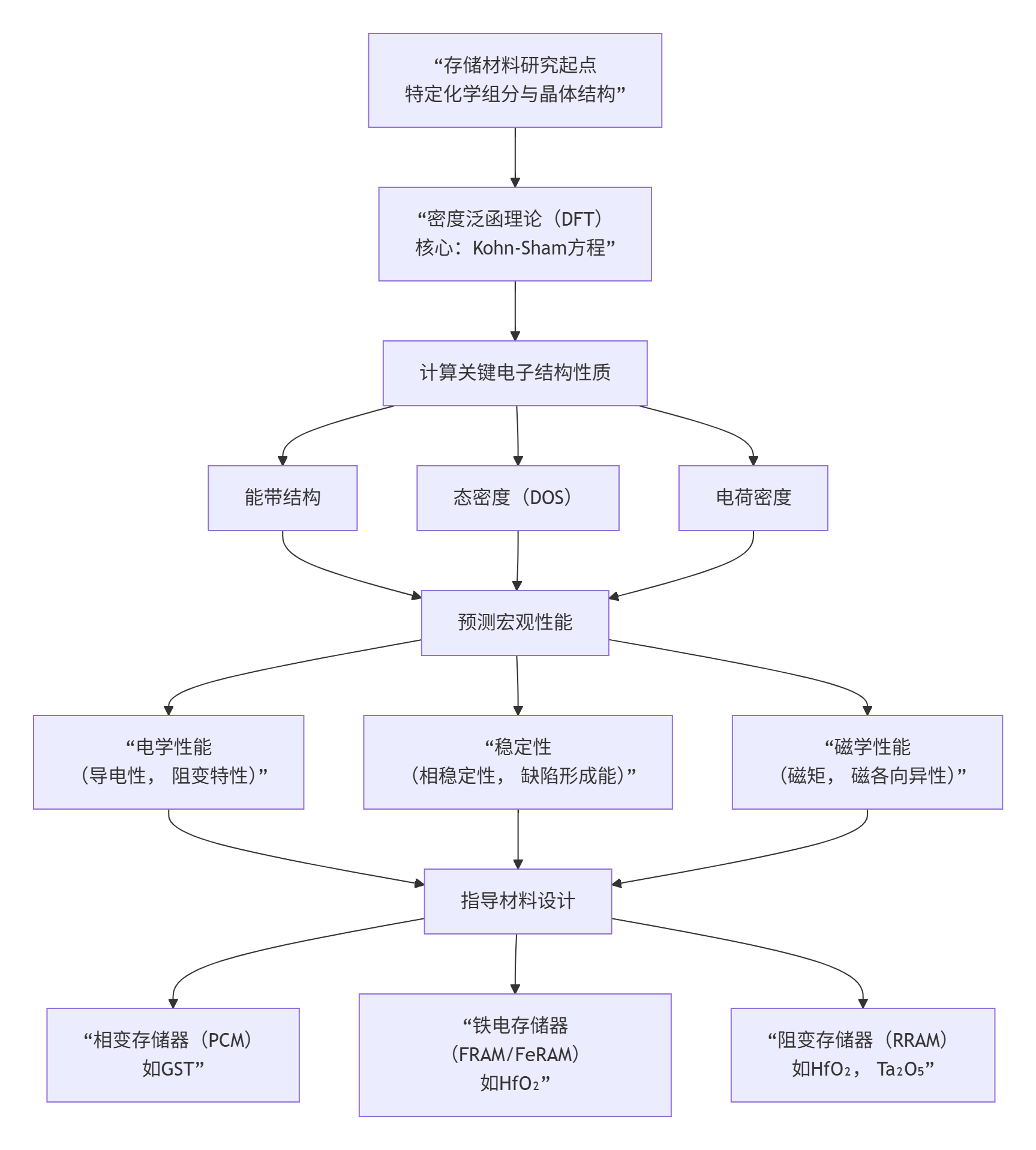 密度泛函理论(Density Functional Theory, DFT)是理解与预测存储材料微观性质的强大理论工具,它通过求解Kohn-Sham方程来规避直接处理多电子薛定谔方程的复杂性,从而高效预测材料的基态性质。下面这张图直观展示了DFT在现代存储材料研究中的核心工作流程与关键预测性质: