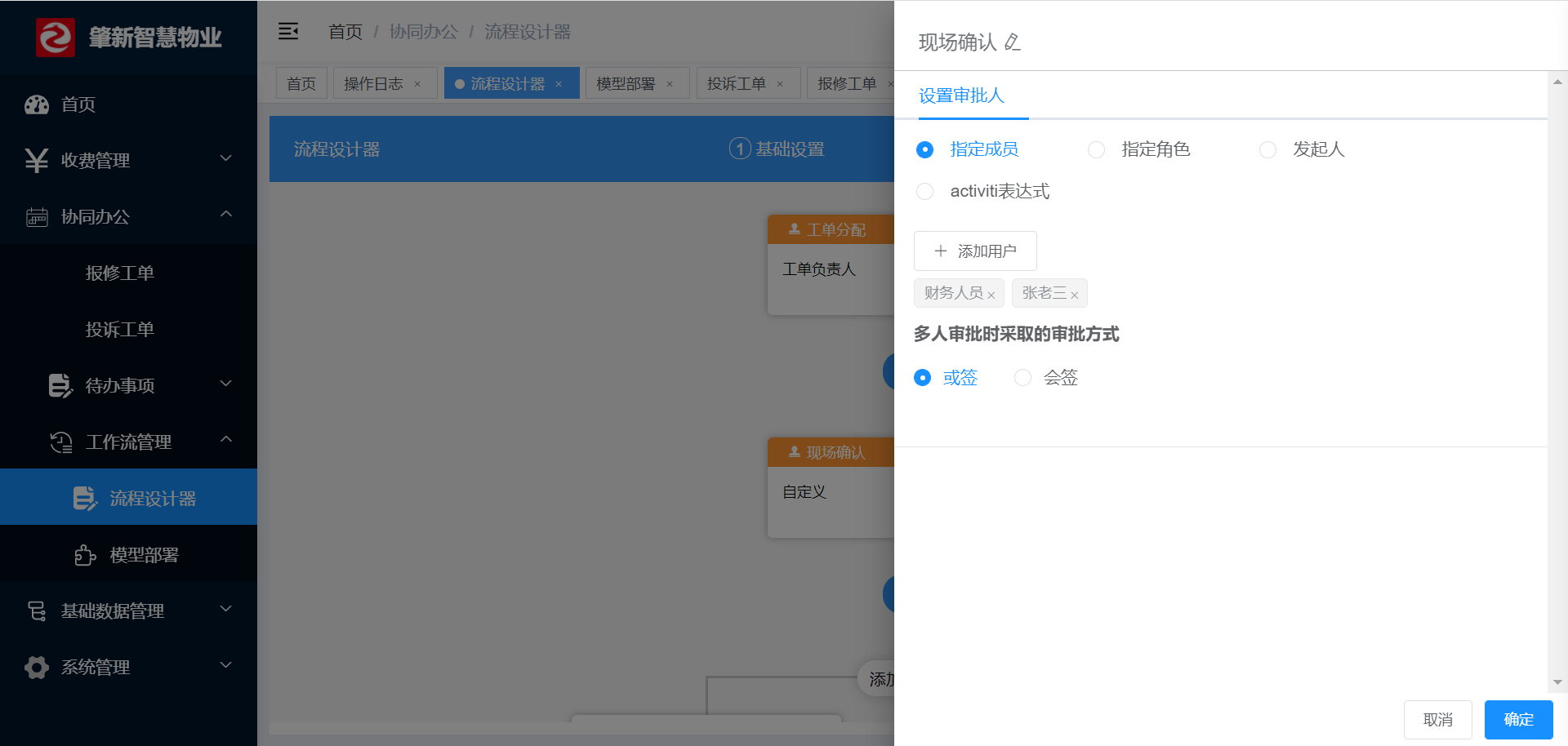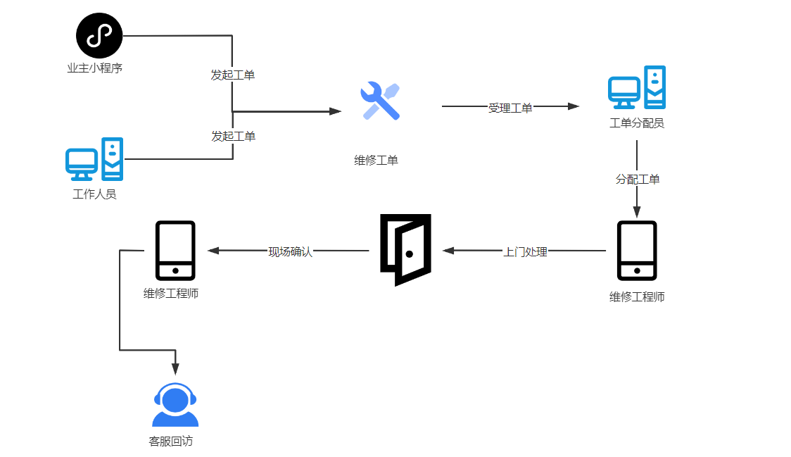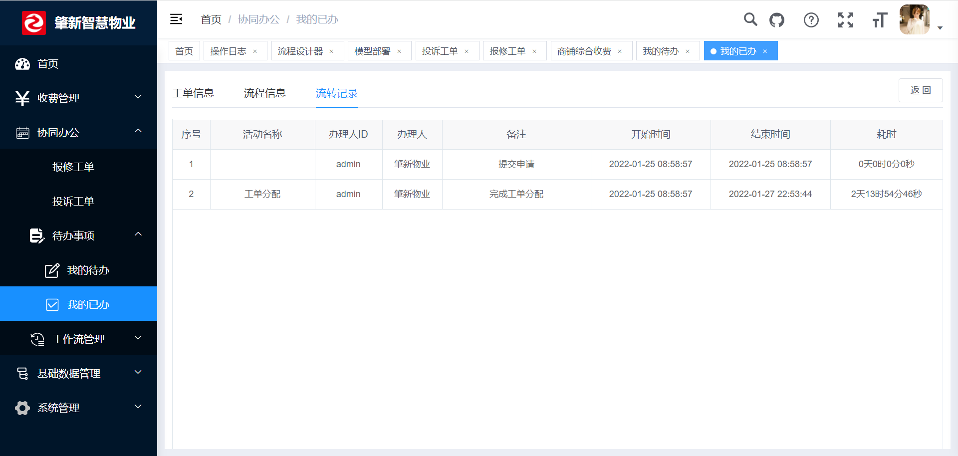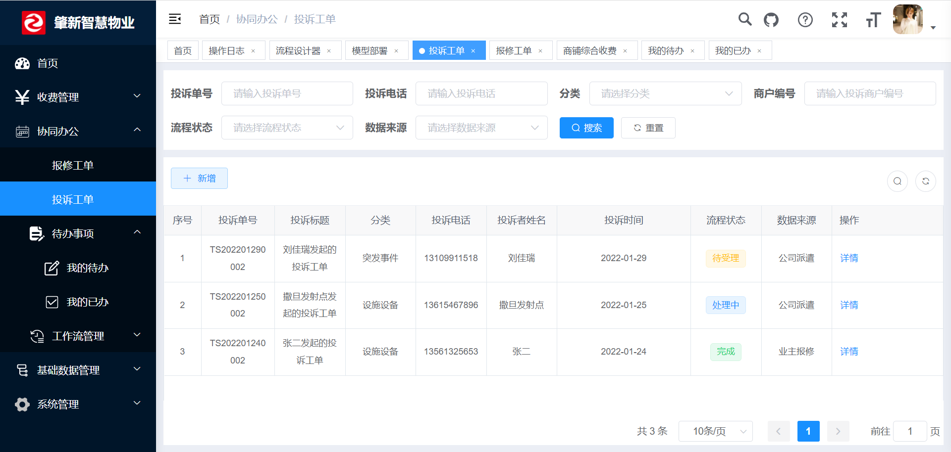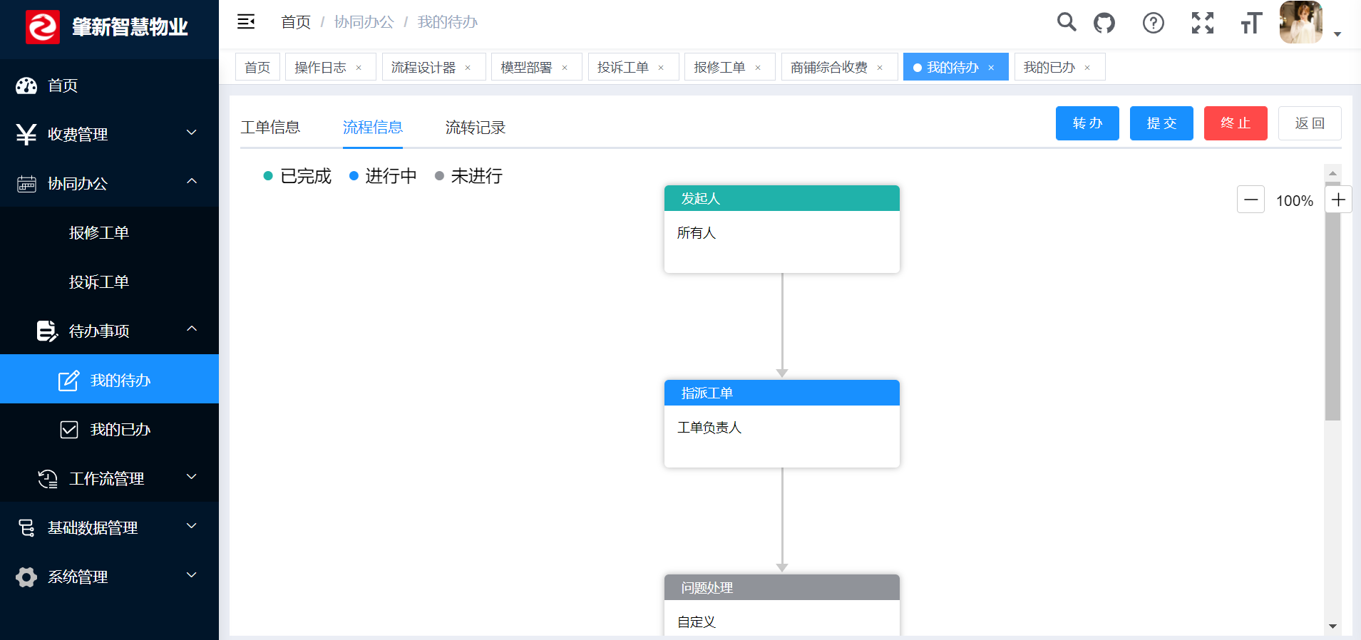 协同办公:集成报修流程、投诉流程,并内置流程设计器,支持自定义配置各类业务流程,提升组织协同效率和服务响应速度。