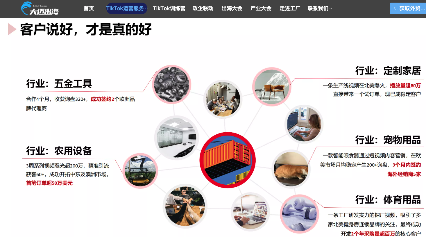 大迈出海(Dmoversea)是全球短视频行业外贸营销的开拓者与引领者,一家专注于全球短视频生态服务发展的企业。公司以“助力中国制造走向世界”为使命,致力于打破传统外贸模式的局限。依托TikTok、抖音等全球主流短视频平台,构建集内容创作、账号运营、网红营销、品牌推广于一体的新型外贸营销生态,帮助国内制造企业实现从内贸到外贸的顺利转型,加速开拓国际市场,提升品牌全球影响力,实现利润增长与弯道超车。自2021年成为TikTok官方上榜服务商以来,大迈出海与上千位网红达人建立了合作,并在2023年全面发力外贸B2B服务。凭借其在TikTok与Facebook社媒代运营服务领域的深耕,已成为众多工厂与外贸企业信赖的出海伙伴,是真正的外贸询盘无忧服务商。