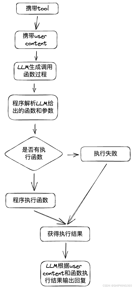 | 3. LLM生成调用指令 | {"name":"get_weather","arguments":{"location":"北京"}} |