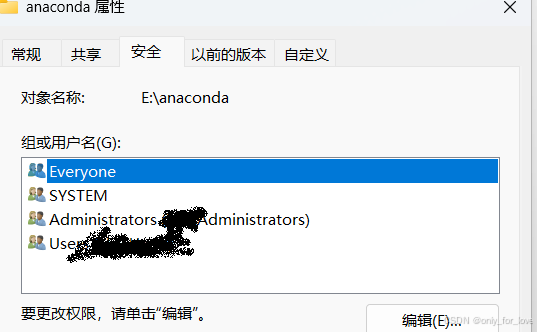 但是改权限时手残只点一个写入会导致conda报错:PermissionError(13, '拒绝访问。在cmd或anaconda prompt中输入conda info,显示如图即成功。实际上是anaconda文件没有写入的权限,所以去修改。2.安全-编辑(组的话everyone、user都行)1.对anaconda所在文件右键-属性。在下载numpy时,突然报错。3.勾选完全控制,确定。