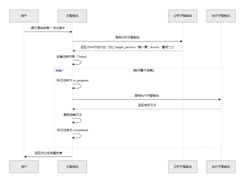 | 子智能体2 (PolicyWritingExecutor) (执行层) | 1. 根据指令修改指定文本片段 2. 生成专业政策文本 | 原始文本片段 + 优化指令 | 修改后的文本片段 | 独立执行(无文件操作) |