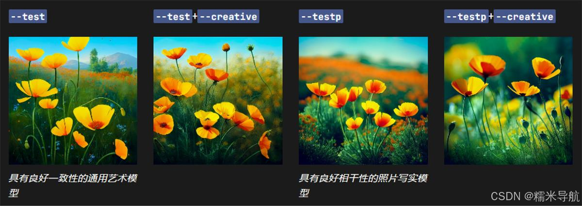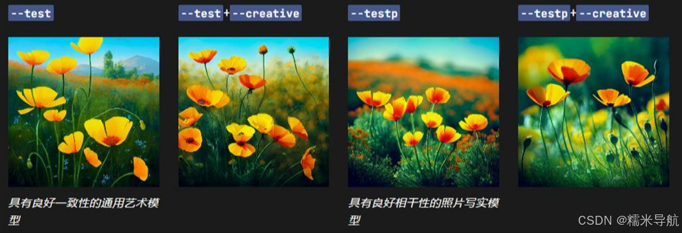 偶尔会临时发布新模型以供社区测试和反馈。目前有两种可用的测试模型:--test 和--testp,它们可以与--creative 参数结合使用以获得更多不同的成分。