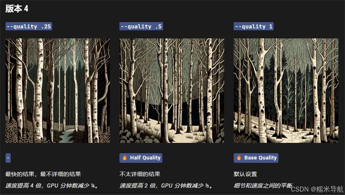 Midjourney V4 模型是由 Midjourney 设计并在新的 Midjourney AI 超级集群上训练的全新代码库和全新 AI 架构。最新的 Midjourney 模型拥有更多关于生物、地点、物体等的知识。它更擅长正确处理小细节,并且可以处理包含多个角色或对象的复杂提示。第 4 版模型支持图像提示和多提示等高级功能。