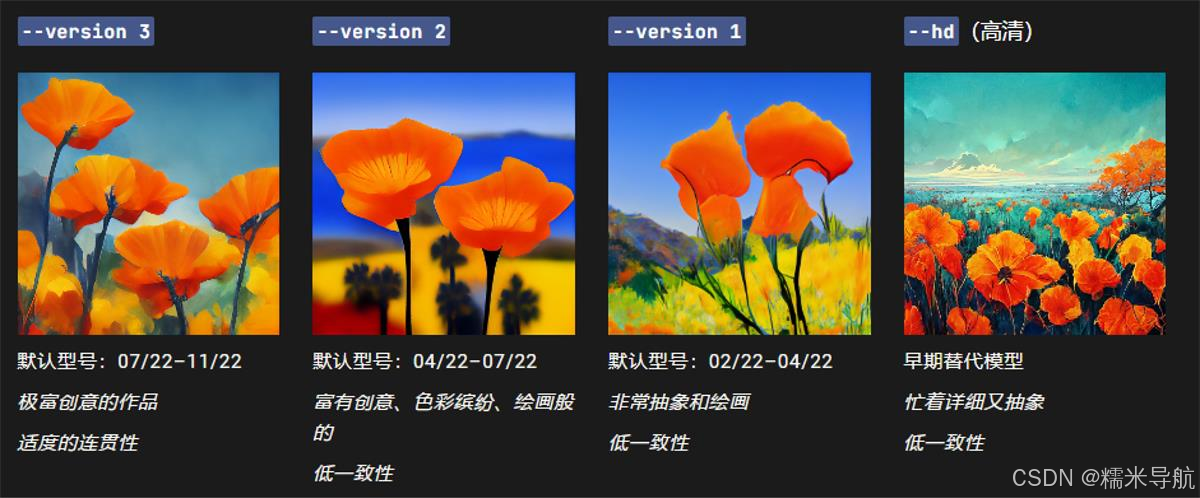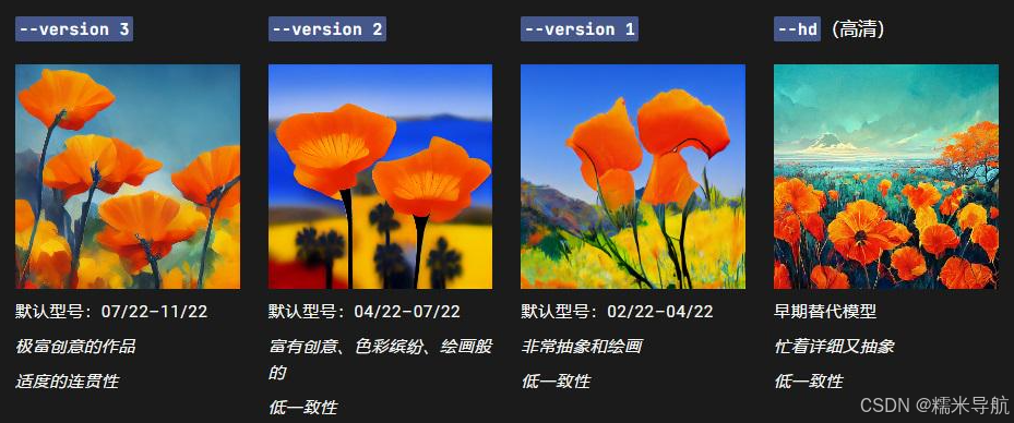 您可以使用--version 或--v 参数或使用/settings 命令并选择模型版本来访问更早的 midjourney 模型。不同的模型擅长处理不同类型的图像。
