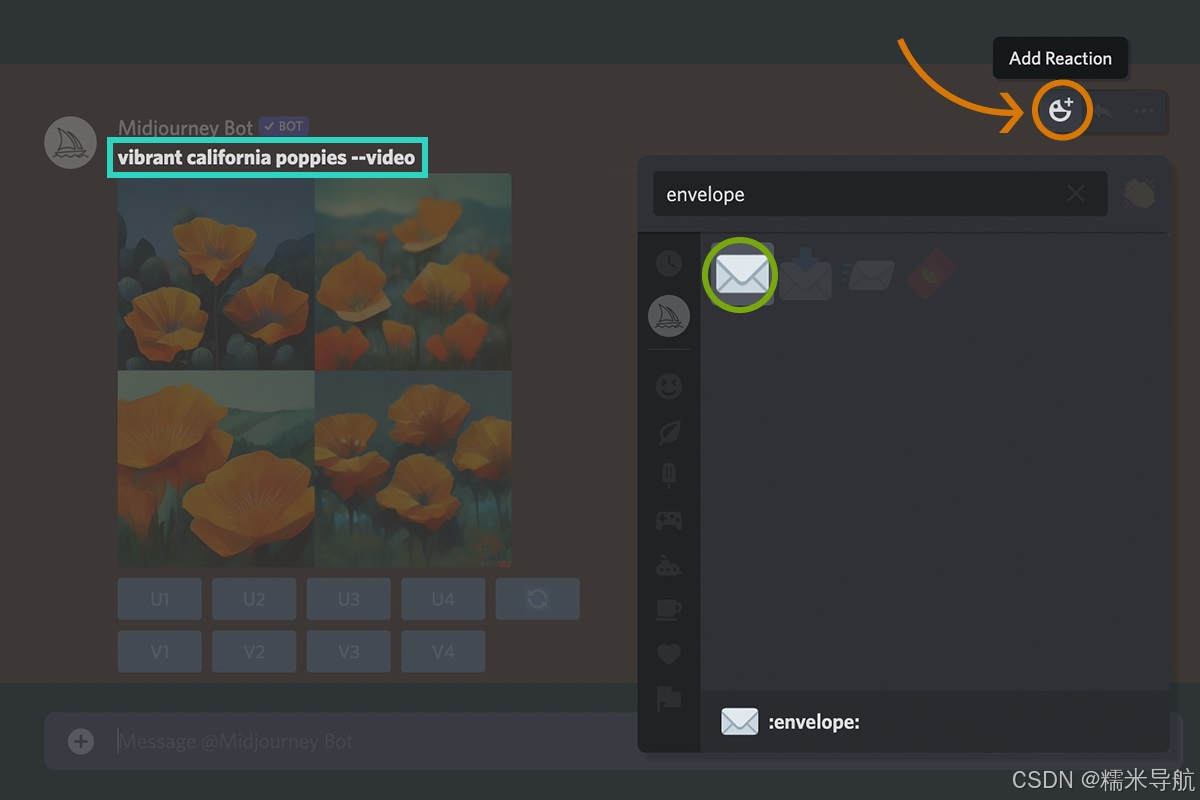 使用该--video 参数创建正在生成的初始图像网格的短片。使用信封 ☉️ 表情符号对完成的工作做出反应,让 Midjourney Bot 将视频链接发送到您的直接消息。