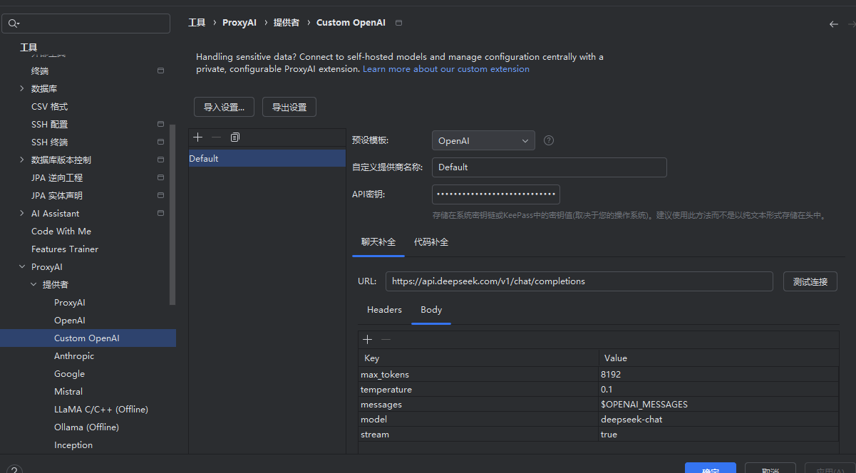 在设置中找到工具,工具->Proxy AI->Custom OpenAI->聊天补全