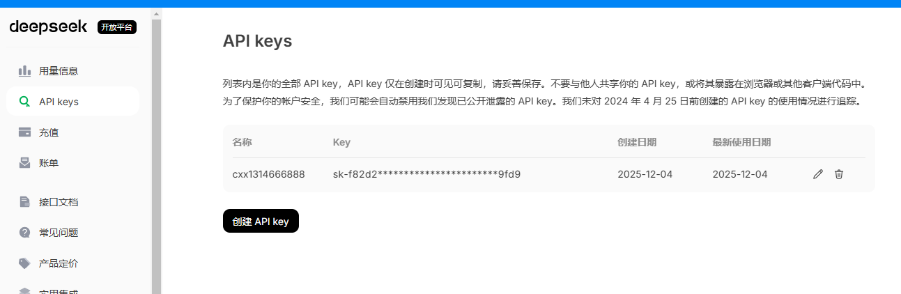 API密钥:https://platform.deepseek.com/api_keys,输入自己的API就可以创建,将密钥复制过来