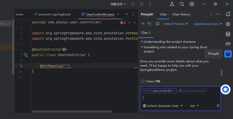 在侧边栏中找到ProxyAI,设置AI类型:Custom OpenAI->Default,引入成功!