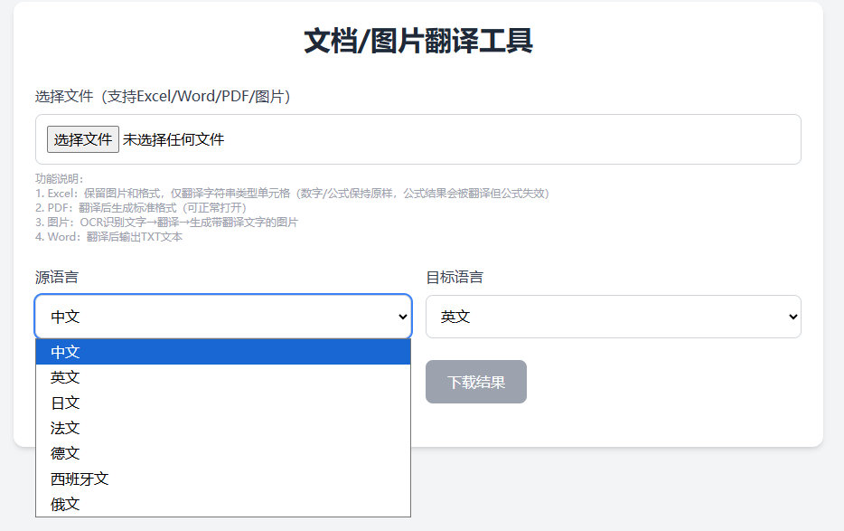 需求是:上传文档,选择要翻译的语言,就可以转出相应的文档,支持:Word文档、Excel表、PDF文档、以及图片。