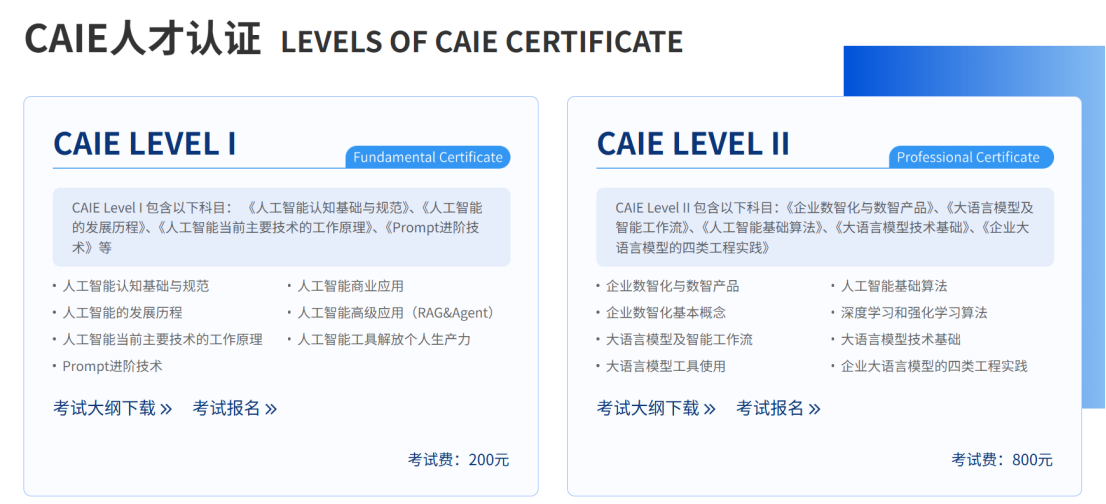 CAIE认证分为两个等级:Level I(基础级)和Level II(专家级)。该认证不局限于计算机专业背景,通过“理论+案例实操”的教学模式,即使是零基础学习者,也能逐步掌握从AI工具使用到项目实操的完整技能。
