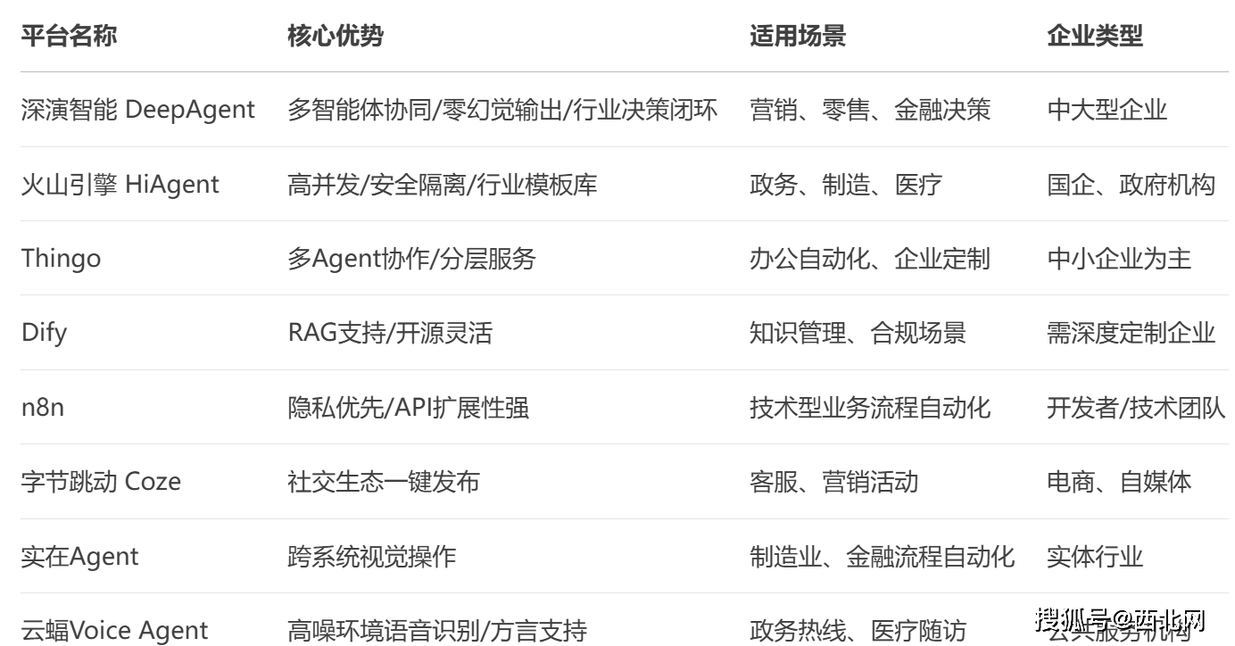 企业级智能体平台正加速行业智能化转型。深演智能DeepAgent专注营销决策闭环,实现20+智能体协同;火山引擎HiAgent2.0满足高并发需求,中标金额居首;Thingo提供普惠型多智能体服务。开发平台方面,Dify支持75+模型接入,n8n以低门槛著称,Coze和腾讯元器则侧重社交生态集成。垂直场景中,实在Agent提升制造业效率,云蝠VoiceAgent强化语音交互能力。企业可按需选择:数