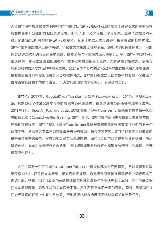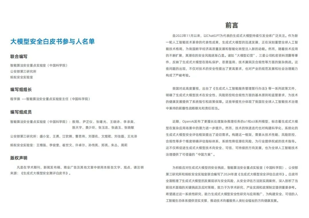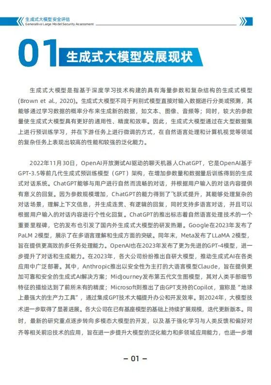 自2022年11月ChatGPT发布以来,生成式大模型在全球范围内引发了广泛关注。这类模型基于深度学习技术,通过海量参数和复杂结构实现文本、图像等数据的生成,推动了自然语言处理和计算机视觉等领域的技术进步。随着其应用的不断扩展,潜在的安全风险也逐渐凸显,如隐私泄露、数据偏见、虚假信息传播等问题,对技术的安全性、合规性及社会影响提出了严峻挑战。本文是一份关于生成式大模型安全评估的白皮书,由智能算法安