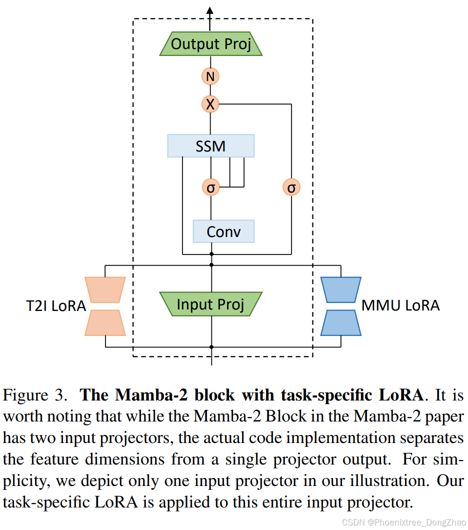 为增强模型任务适应能力,本文引入任务特定适配器。 假设在状态空间模型(SSM)中基于任务显式参数化选择能提升多模态训练的数据效率。具体实现上,为避免参数量激增,采用 LoRA 作为适配器。 如图3所示,OmniMamba仅在Mamba-2各层的输入线性投影层部署任务特定LoRA。 执行特定任务时,输入线性投影与任务LoRA协同作用:例如执行多模态理解(MMU)任务时激活MMU LoRA路径,同时屏蔽文生图(T2I)LoRA路径。 这种显式激活对应适配器的机制有效提升训练数据效率。