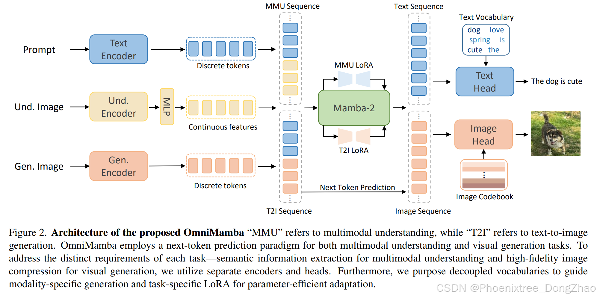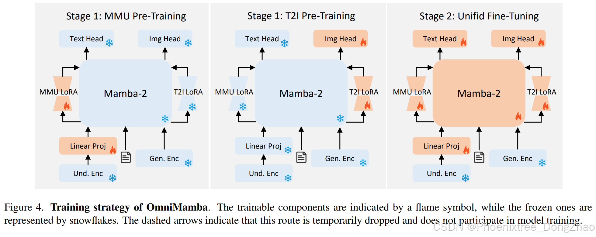 To enhance the model’s capability in handling diverse tasks, we incorporate task-specific LoRA [25]. Specifically, within each Mamba-2 layer’s input linear projection, we introduce distinct LoRA modules for multimodal understanding and visual generation. During task execution, the features are modulated by both the linear projection and the corresponding task-specific LoRA, while the irrelevant LoRA components are deactivated. Furthermore, we propose the decoupled vocabularies to guide the model in generating the appropriate modality, which requires more data for the model to learn. On the data front, we further propose a novel two-stage decoupled training strategy to address the data imbalance between the two tasks, significantly improving training efficiency.