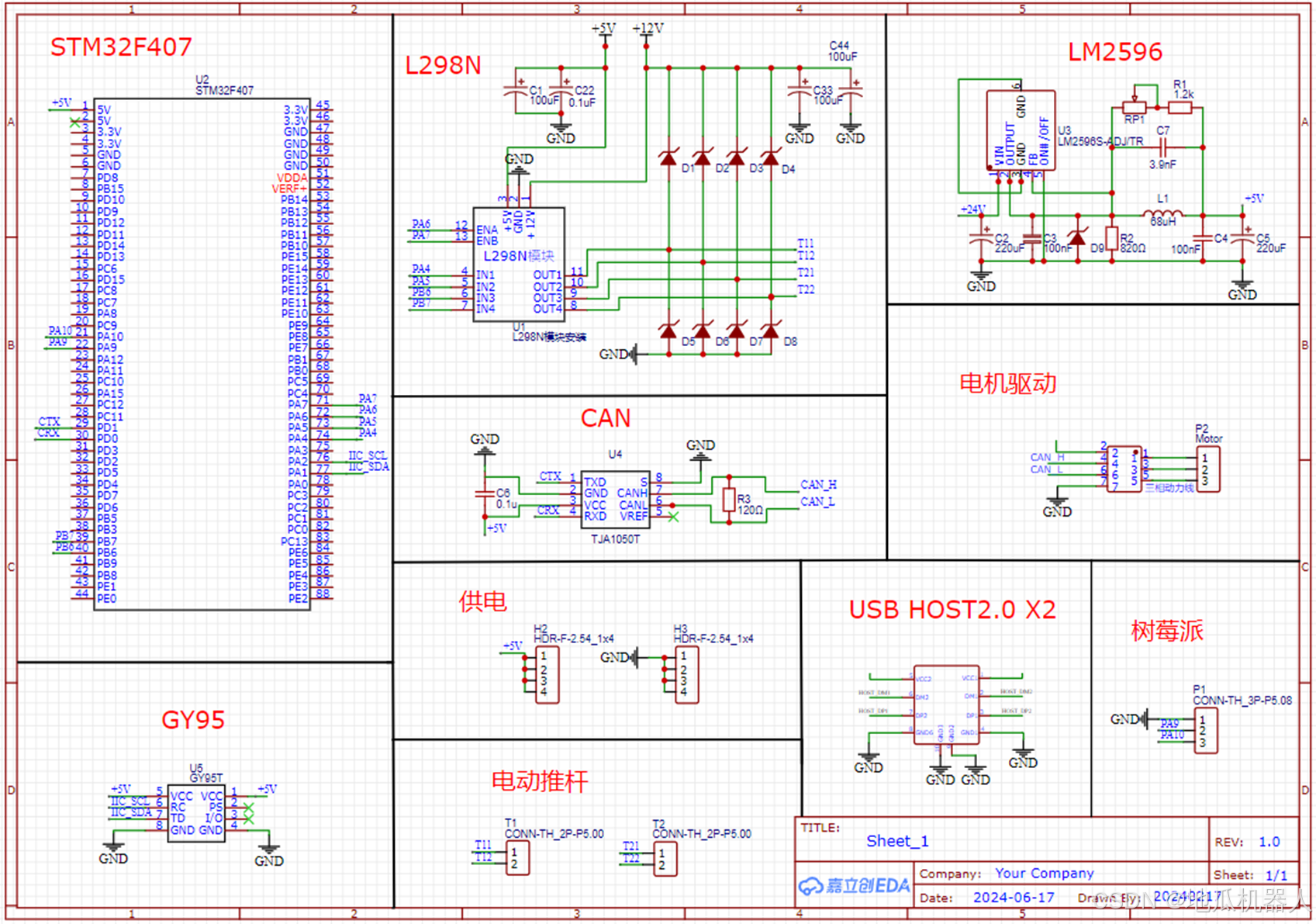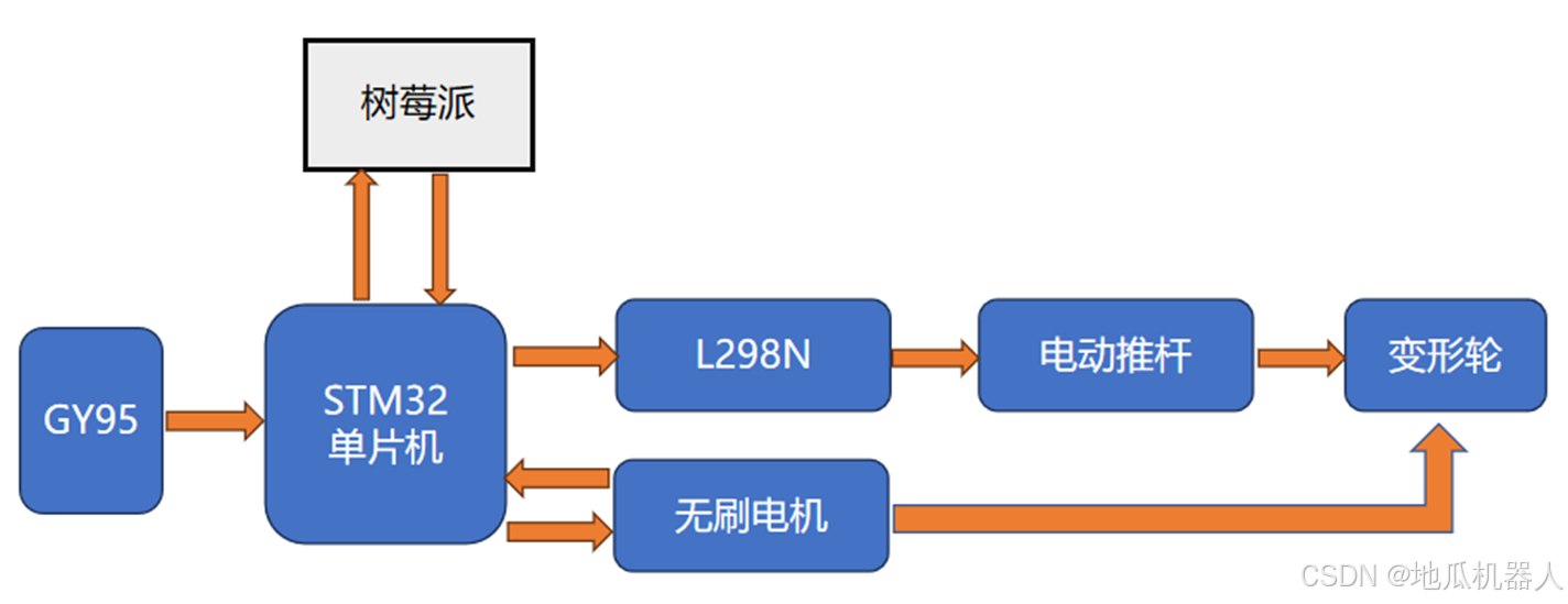 本系统的硬件连接方式如下:树莓派负责读取相机图像数据和地图建模,并将里程计数据发送给STM32来控制机器人移动。RDK X3主要处理语音交互和视觉识别,并在屏幕和触摸屏上显示结果。STM32控制机器人的底盘运动,通过CAN总线控制电机转动,通过PWM波控制电动推杆的伸缩,并与树莓派实时通信,反馈机器人运动状态信息。