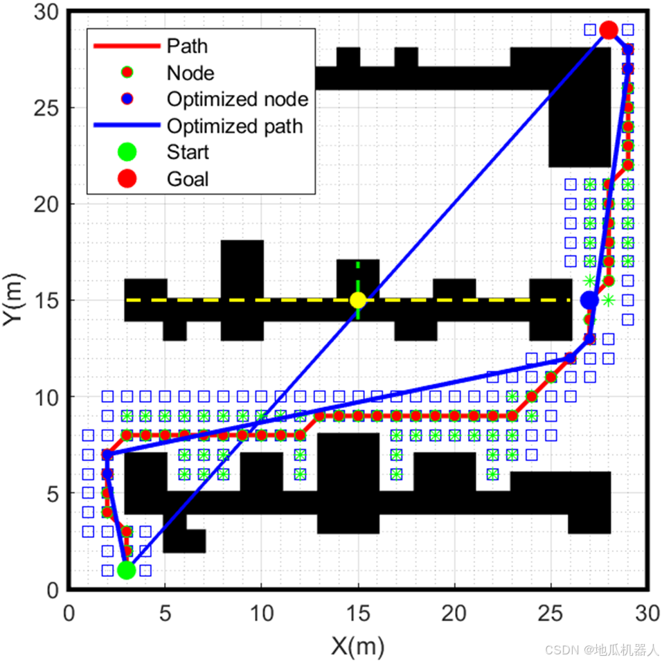 - 如果连接线段不与障碍物相交,直到目标点,保留目标点并移除起始点与目标点之间的节点。