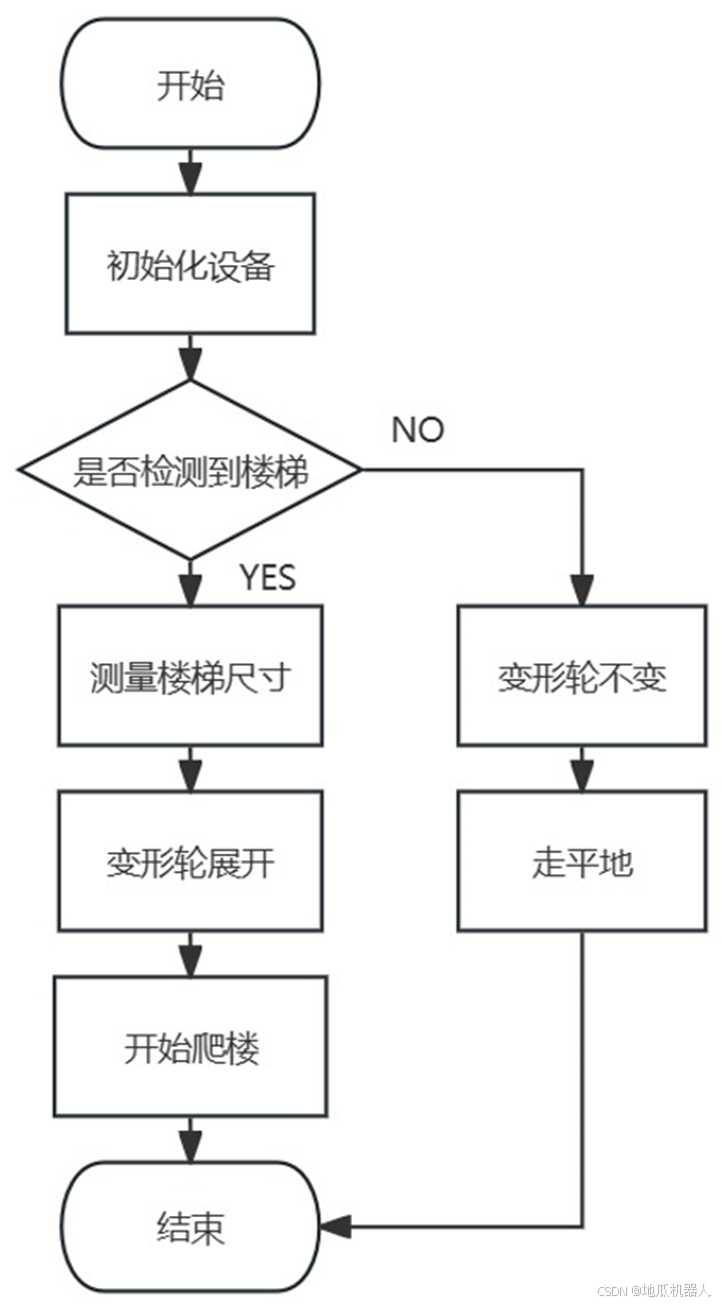5.3 底盘控制软件流程 在本作品中,底盘控制采用 STM32 单片机作为主控芯片,其程序结构图如 图所示。当机器人在运动的过程中,会不断检测前方是否有楼梯,没有检测到楼 梯,变形轮不变形维持原状;当检测到楼梯,根据测量的楼梯尺寸,STM32 控制 变形轮变形到特定的扩大程度和旋转角度后,开始爬楼。