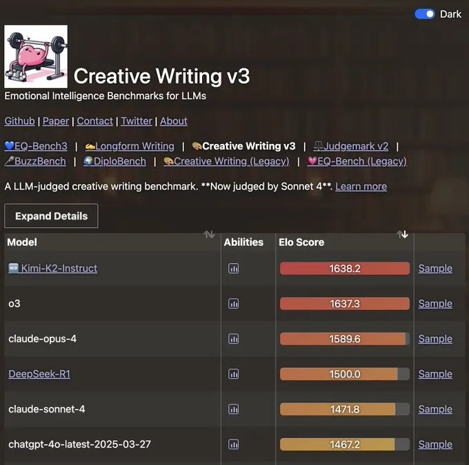 情感智能测试中,EQ-Bench 3 数据显示,Kimi K2 在挑战性角色扮演场景的 Elo Score 达 1549.1,超越 o3、Gemini 等模型,证明其理解、回应人类情感的能力,在客服、教育等需情感交互的场景,有独特应用价值。