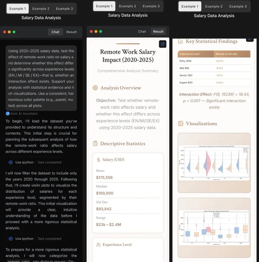 实际业务场景中,Kimi K2 也展现出强大的数据处理能力。如薪资数据分析任务里,它能按要求加载、清洗数据,完成可视化分析与统计检验,输出规范报告,证明在复杂文本 + 数据分析场景的实用性。