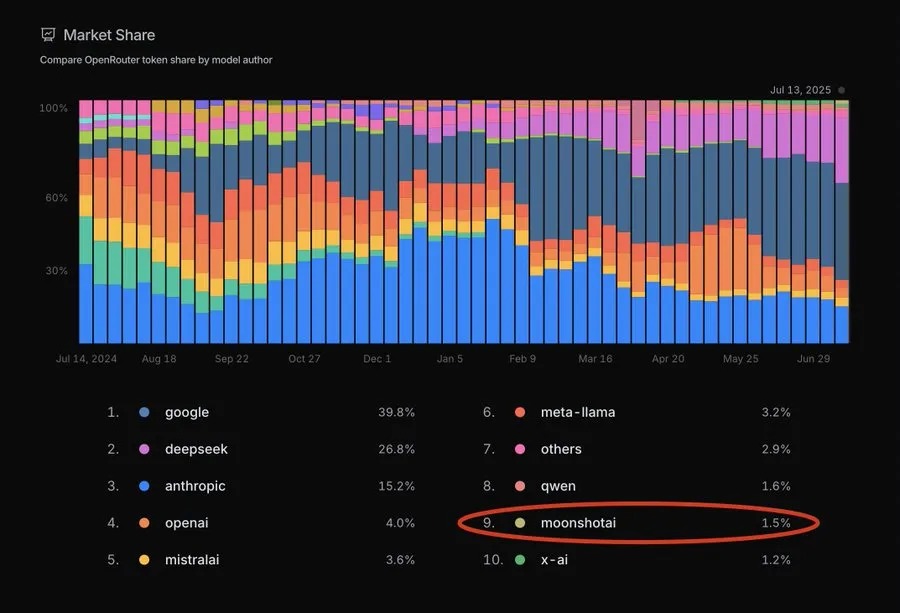 当开发者们还在为 xAI 推出的 Grok 4 争论 “全球最强” 的头衔时,一款来自中国的大模型已经悄然改写了竞争格局。月之暗面发布的开源 MoE 架构模型 Kimi K2,在上线不到 48 小时内,就在 OpenRouter 平台的 token 使用量上超越了 Grok 4,用实打实的市场热度证明了自身实力。