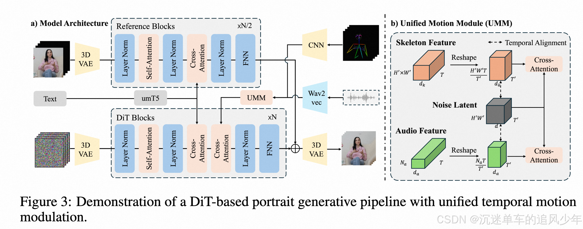 虽然基于DiT的扩散模型在真实感人像动画中表现出优于UNet架构的潜力- -特别是在跨不同场景和角色身份的泛化、实现自然主义的人物渲染以及将人像与环境上下文无缝集成方面- -但它们对基于VAE的时间降采样特征的依赖引入了一个关键的限制。具体来说,时间下采样运动条件(例如,唇部发音,面部表情和骨骼运动)与潜在视频时间维度对齐的标准做法不可避免地丢弃了对同步快速嘴唇和手势运动至关重要的高频和细粒度运动细节。为了解决这些挑战,我们提出了一种时间运动条件调制机制,统一所有运动条件以匹配视频潜在的时间维度,同时按比例扩展特征维度以保持运动粒度。该机制为将具有不同采样频率的多样化运动信号集成到预训练的扩散转换器中奠定了可扩展的基础,解决了由潜在空间时间压缩引起的保真度下降问题。