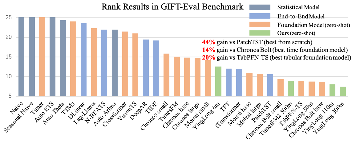 - YINGLONG模型在GIFT-Eval基准测试中取得了显著的性能提升,特别是在能源、自然和交通领域,平均排名从9.2提升到4.3,从4.6提升到3.8,从6.9提升到5.2。