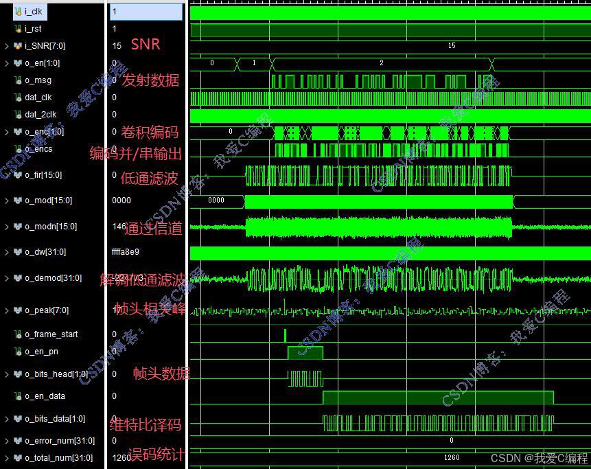 系统包括BPSK调制模块,BPSK解调模块,217卷积编码模块,维特比译码模块,AWGN信道模块,误码统计模块,帧同步模块,数据源模块等。