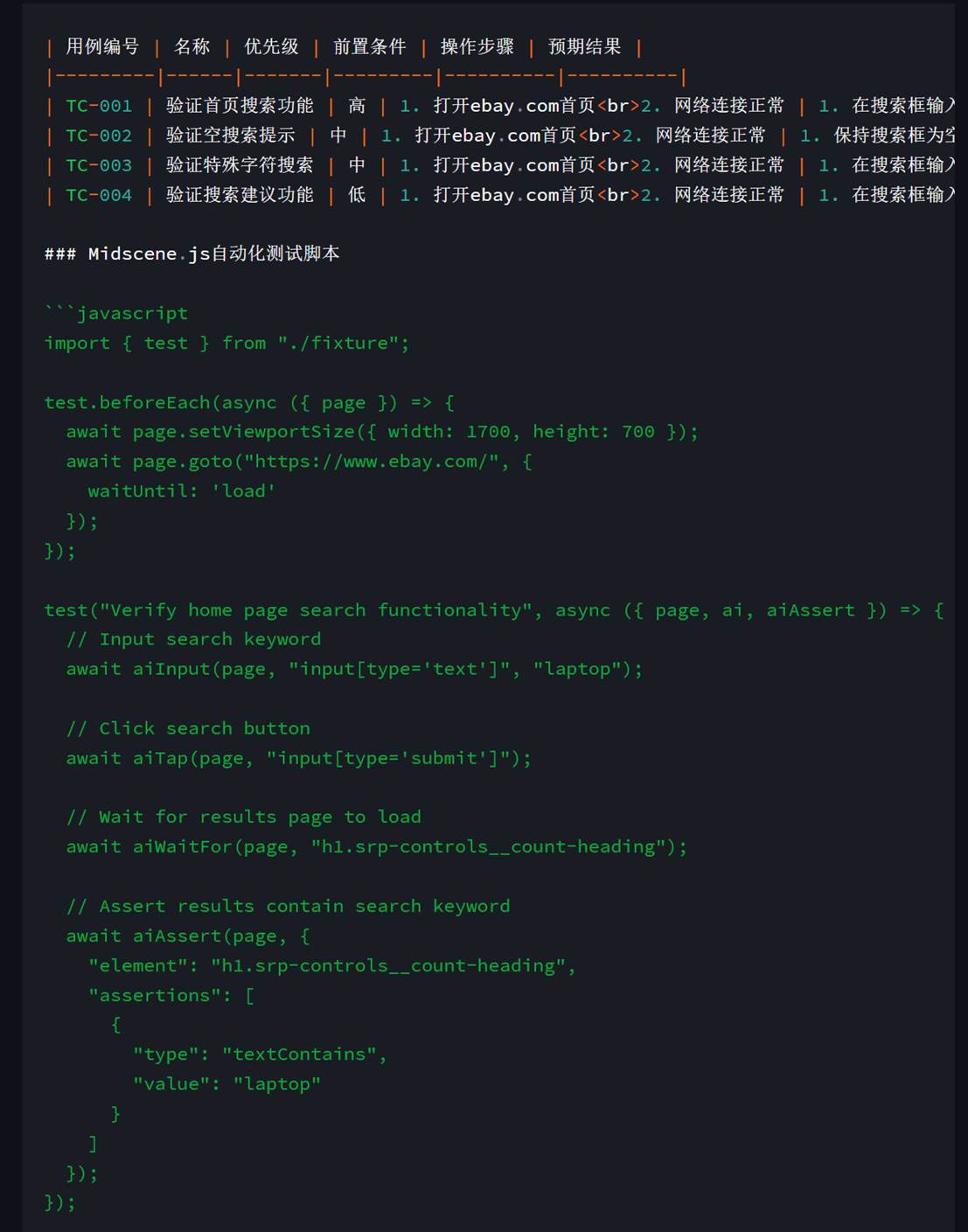请编写每一个测试用例对应的midscene.js javascript的英文自动化测试脚本,务必确保语法正确。web输出格式形如: