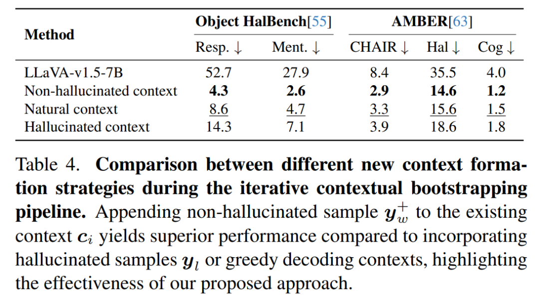 上表显示对比幻觉句子、非幻觉句子和贪婪解码生成句子作为新上下文的实验,采用非幻觉上下文可显著提升模型判别能力并减少输出幻觉,证明在首次幻觉出现时干预的关键性。