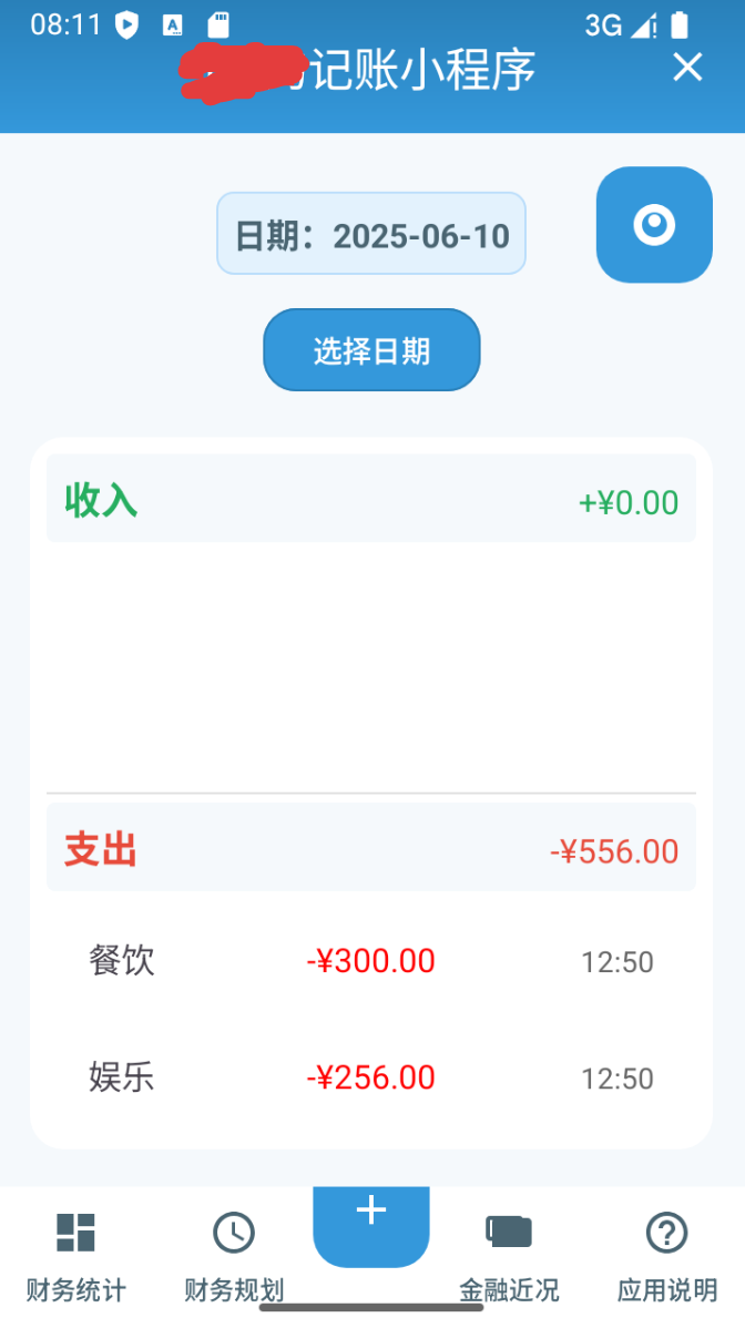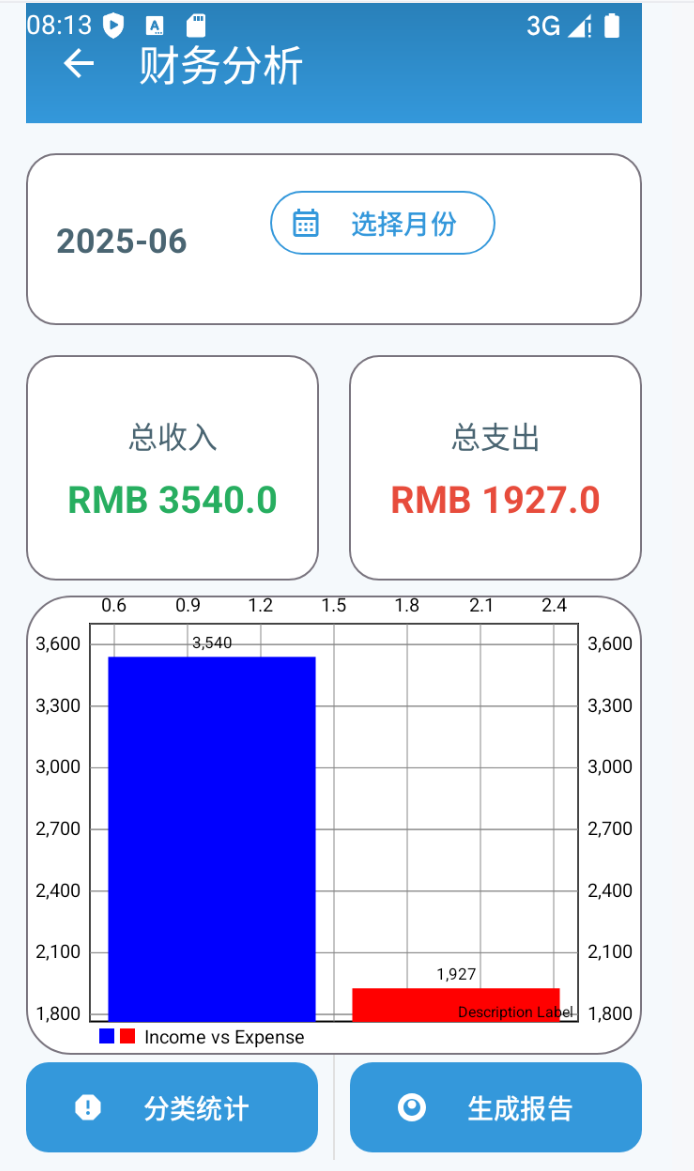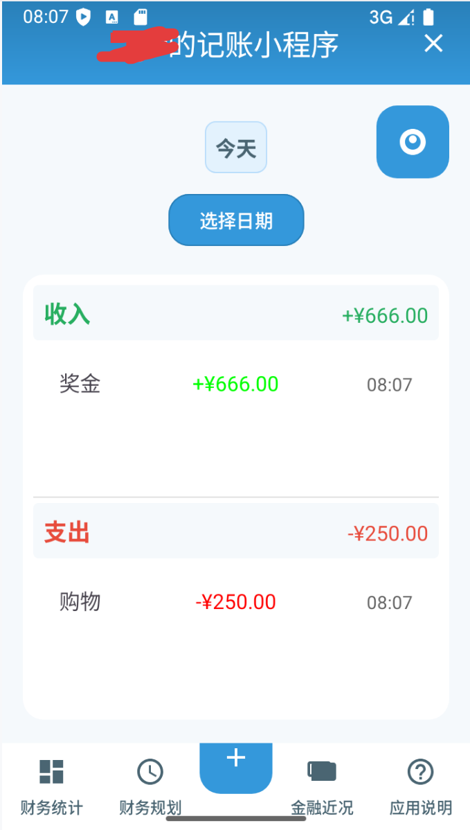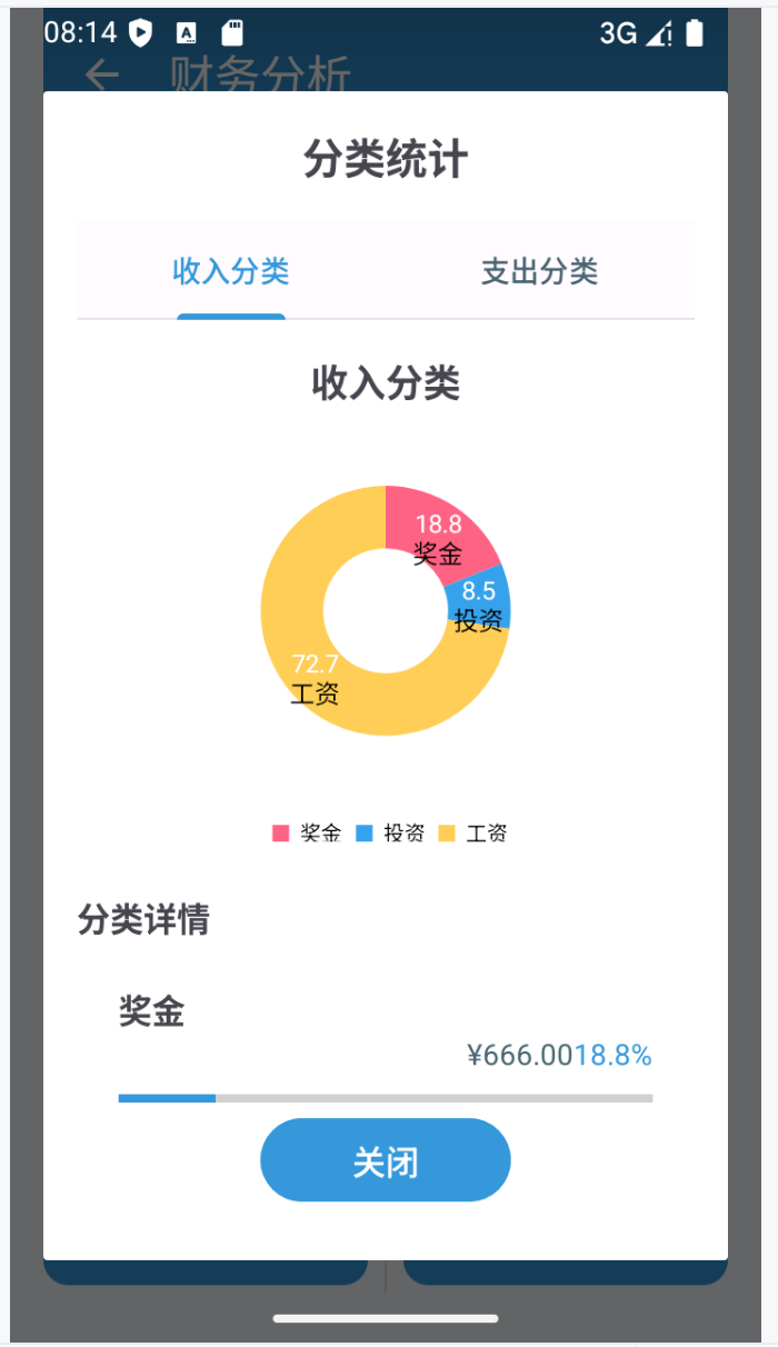 可以点击“选择日期”查看不同日期的记录。除此以外,还可以点击“财务统计”跳转到财务统计页面,该页面通过可视化的方式呈现不同月份的总收入支出,再点击财务统计页面中的“分类统计”按钮,可查看详细不同类别的总收入和支出。