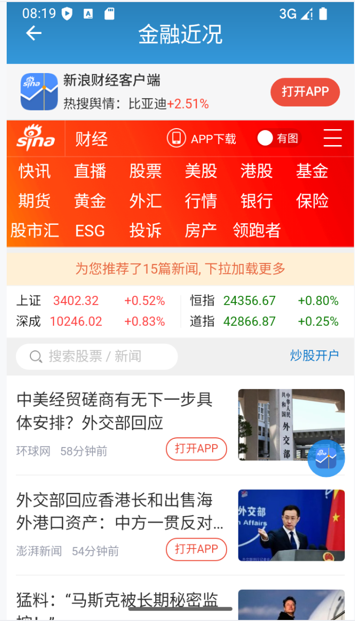 点击主页面的“金融近况”可进入到金融近况页面,该页面可跳转到新浪财经,了解最新的金融资讯。