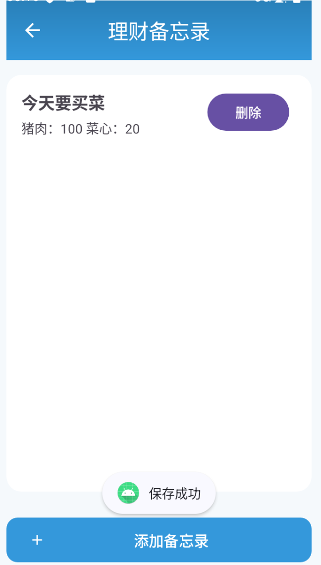 点击主页面“财务规划”可进入财务规划页面,该页面提供用户备忘录记录的功能,用户可在该页面记录或者删除备忘录。
