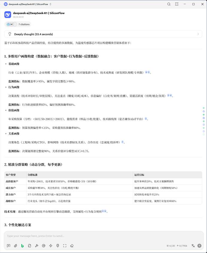 通过这个基础提示词,DeepSeek能够快速整合相关信息,生成包含内部优势(技术积累、大客户成功案例、团队经验)、内部劣势(品牌认知度、渠道覆盖、成本结构)、外部机会(市场需求增长、数字化转型、政策支持)、外部威胁(价格竞争、大厂下沉、客户预算紧缩)的完整分析矩阵。基础版能够解决80%的日常战略分析需求,让你快速获得决策框架。