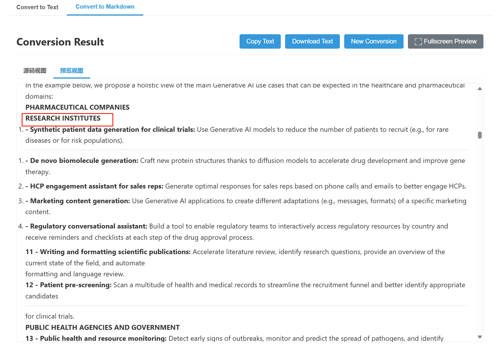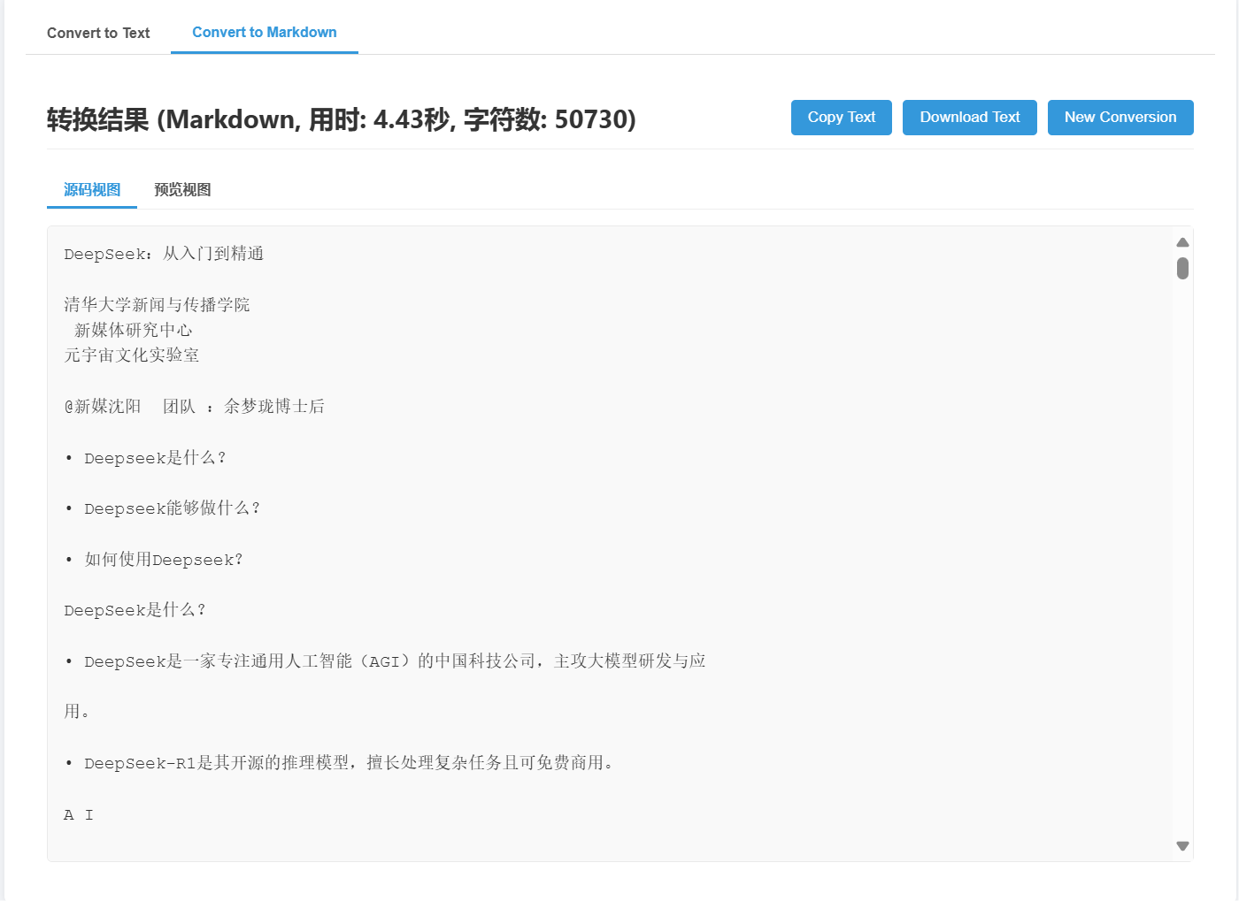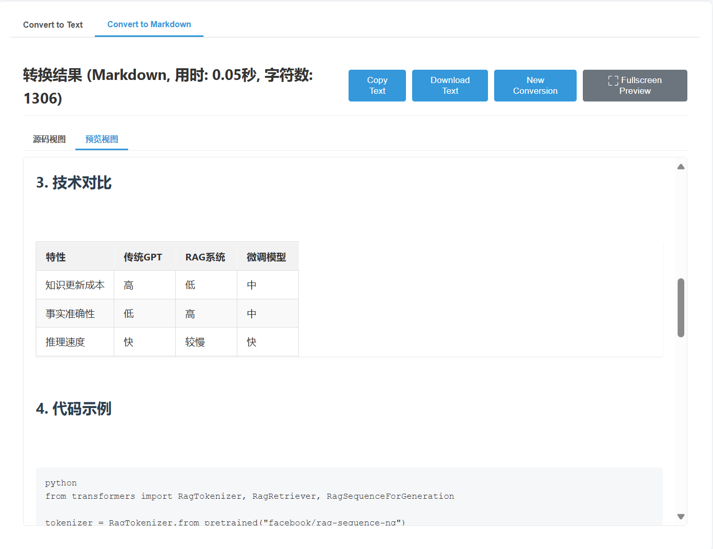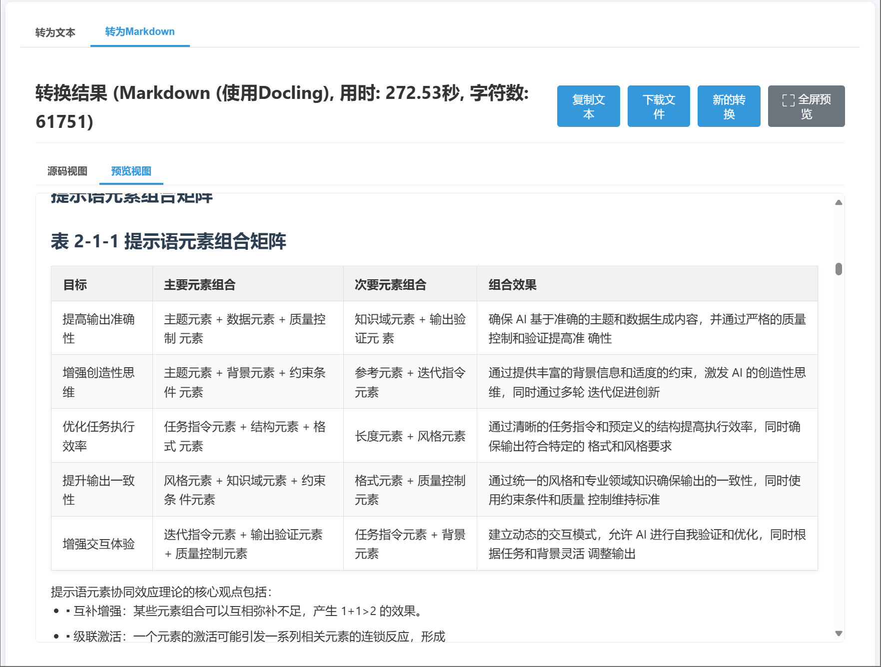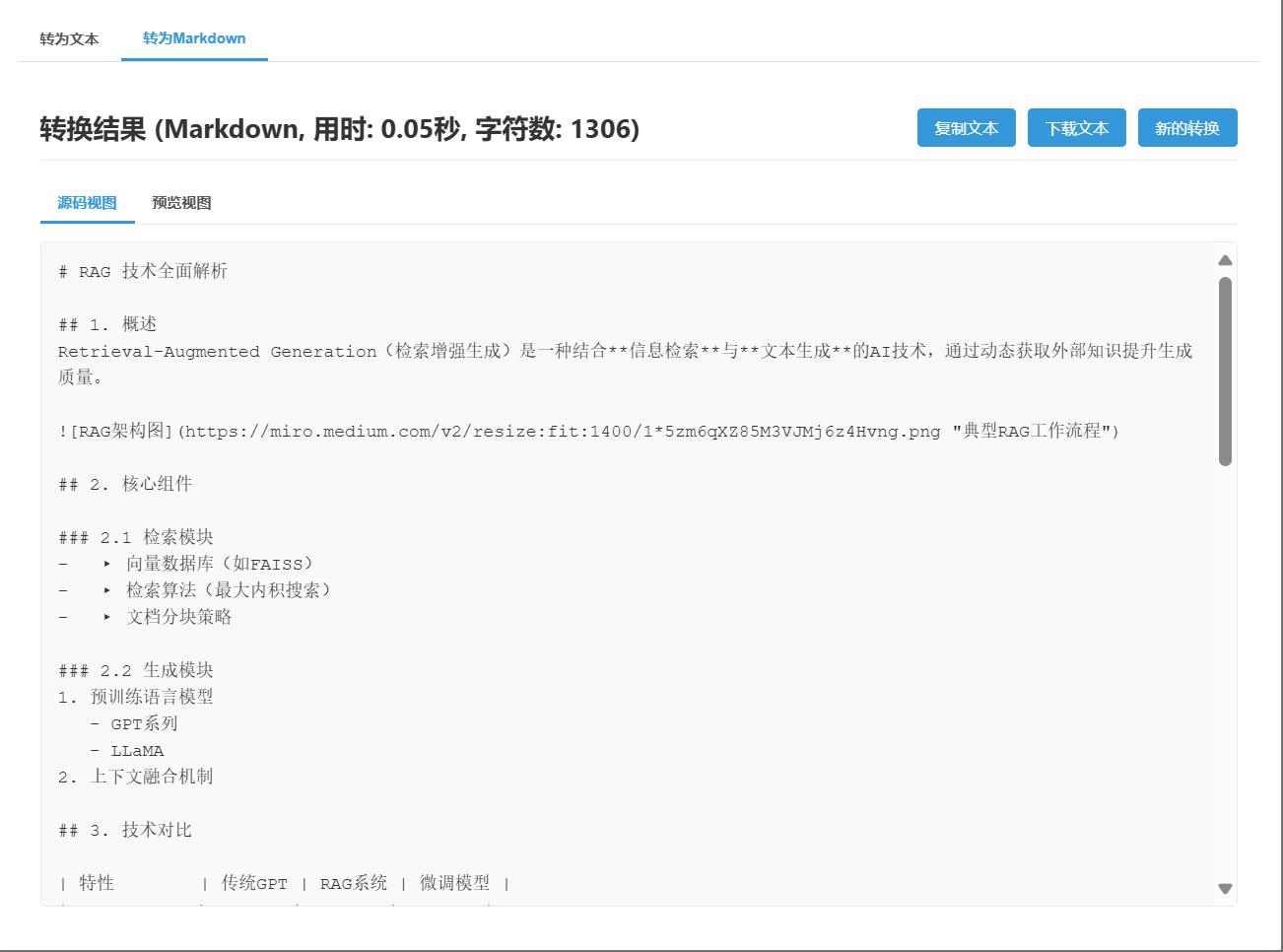 准确的结构保留:在Markdown模式下,能够精确保留原始文档的层级、标题、列表、表格等结构,确保内容逻辑清晰。