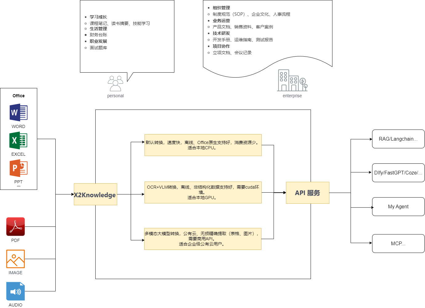 X2Knowledge:是一款面向企业知识库建设的高效开源知识提取工具。它支持将 PDF、Word、PPT、Excel、WAV、MP3 等多种格式的文件,智能转换为结构化的 TXT 或 Markdown 格式内容,帮助企业快速、标准化地将各类文档资料录入知识库系统。