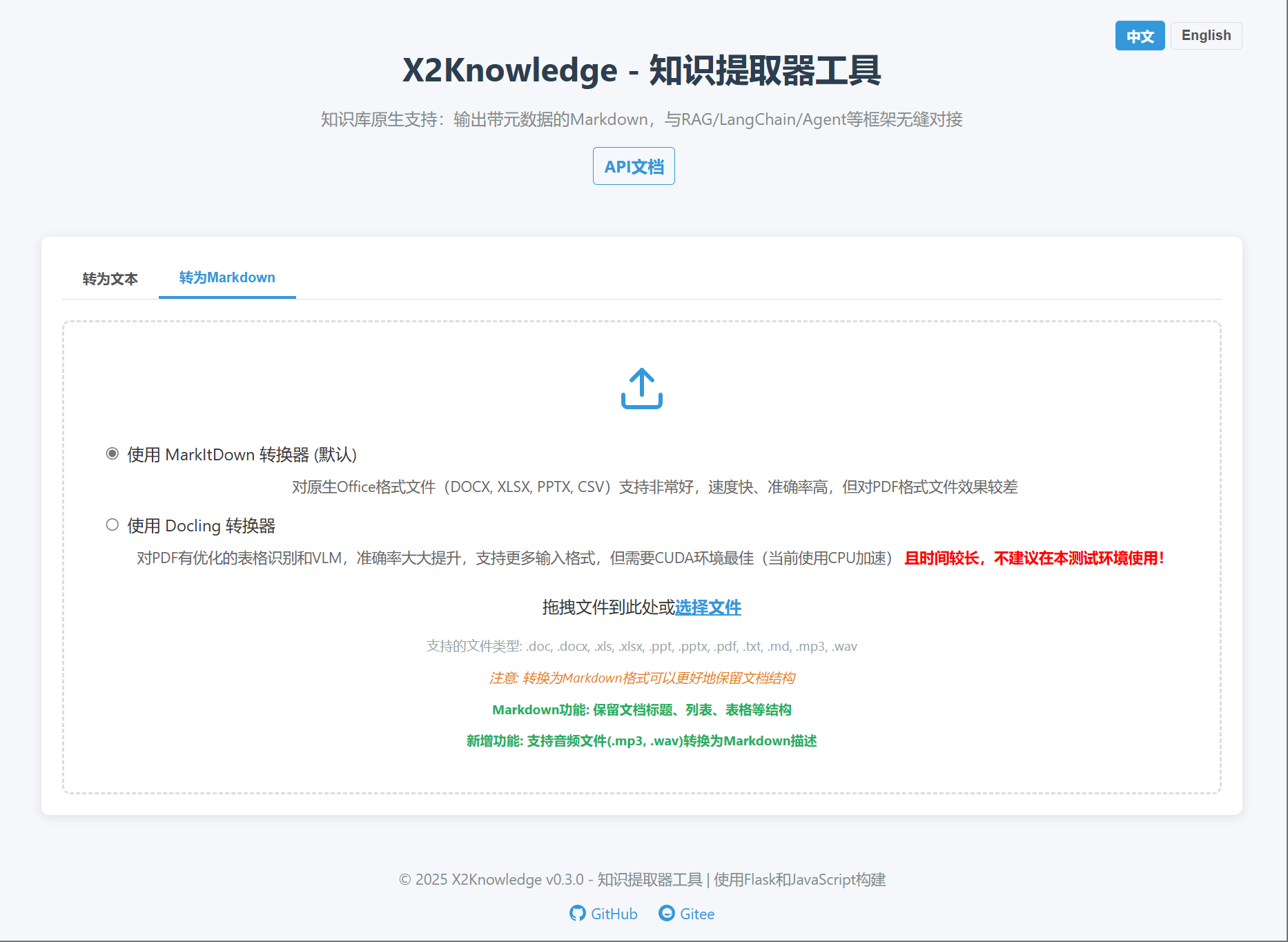 支持将音频文件(.mp3, .wav)转换为文本或 Markdown 描述