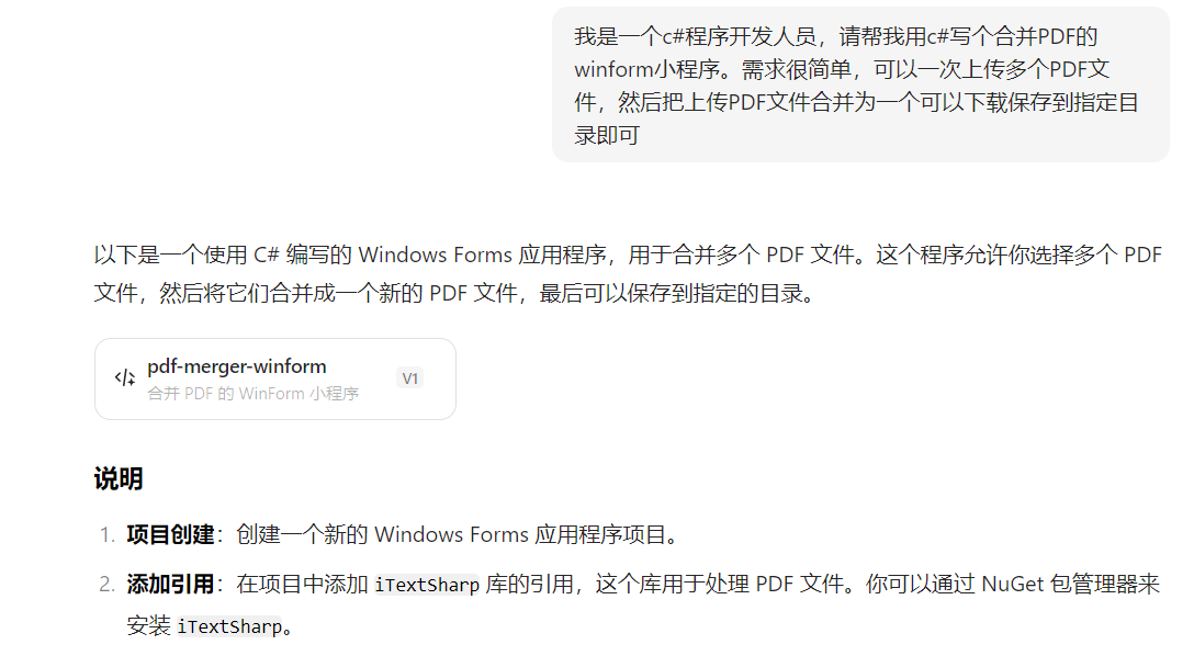 以合并PDF程序为例,我本身是精通C#Winform编程的,对C#语言很熟悉。现在我准备自学python,但是对python我之前没了解过,完全不懂,但是通过网上基础搜索配置环境后,通过豆包AI平台可以快速实现相同的编程语言开发,发布后即可成为exe程序。本文先重点介绍下整体效果,我先用c#实现了这一功能,然后用python1小时内实现了同样的功能。如python环境如何配置网上都有很多教程,本次暂时不做介绍。如果有需要后面我会专门写个.net开发人员如何一点点进行Python、JAVA环境配置的,站在.net视角去借助AI了解其他语言,会有事半功倍的效果。