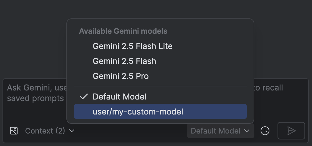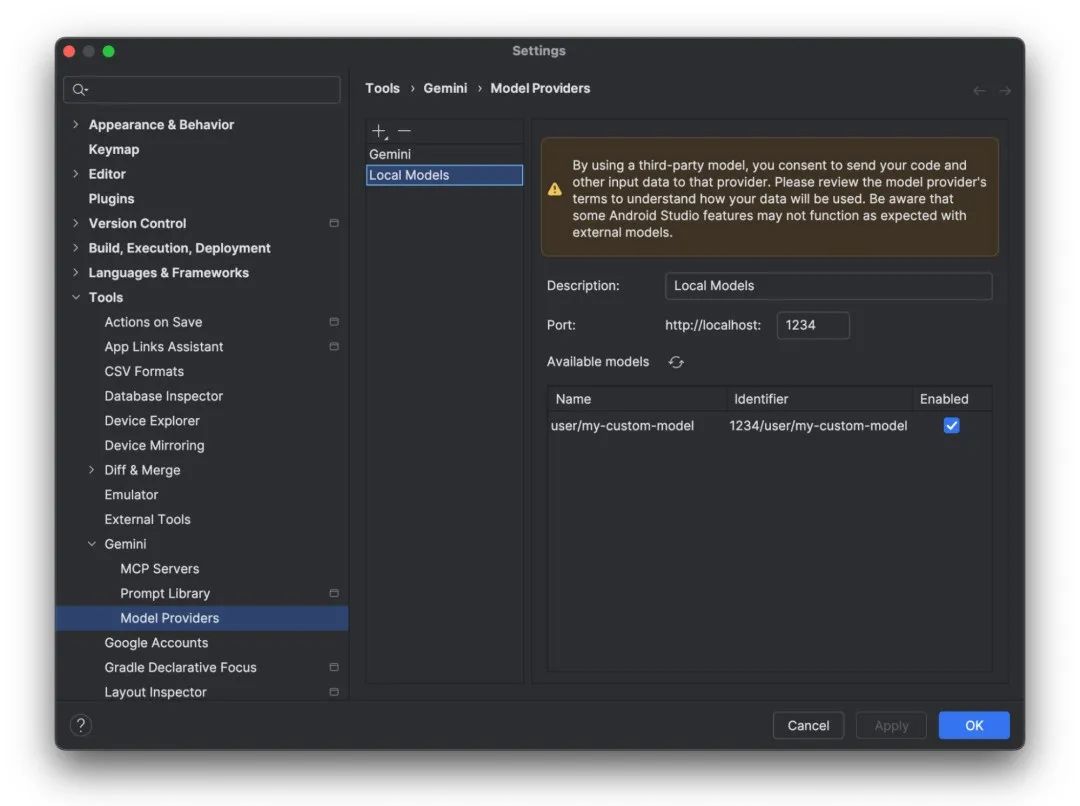 在 Android Studio 中选择您的模型:在 Android Studio 中,依次选择 "设置">"工具">"Gemini">"模型提供程序",点击 "+" 按钮添加本地模型提供程序并启用模型。现在,打开 Gemini 聊天窗口,使用模型选择器从默认 Gemini 模型切换到已配置的本地模型。