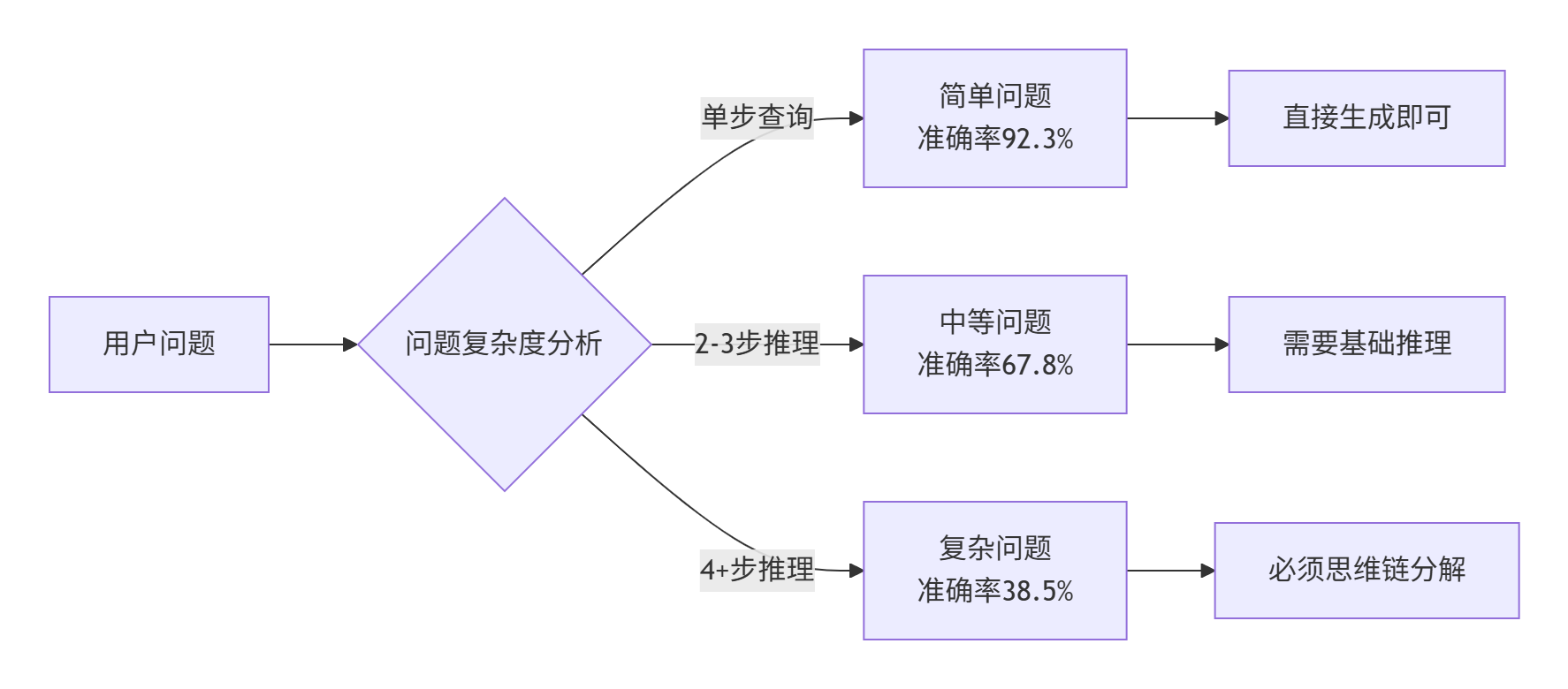 在构建MateChat智能问答系统的三年中,我们发现:对于简单事实性问题,大模型表现优异(准确率>90%),但面对需要多步推理的复杂问题,直接生成的效果急剧下降。