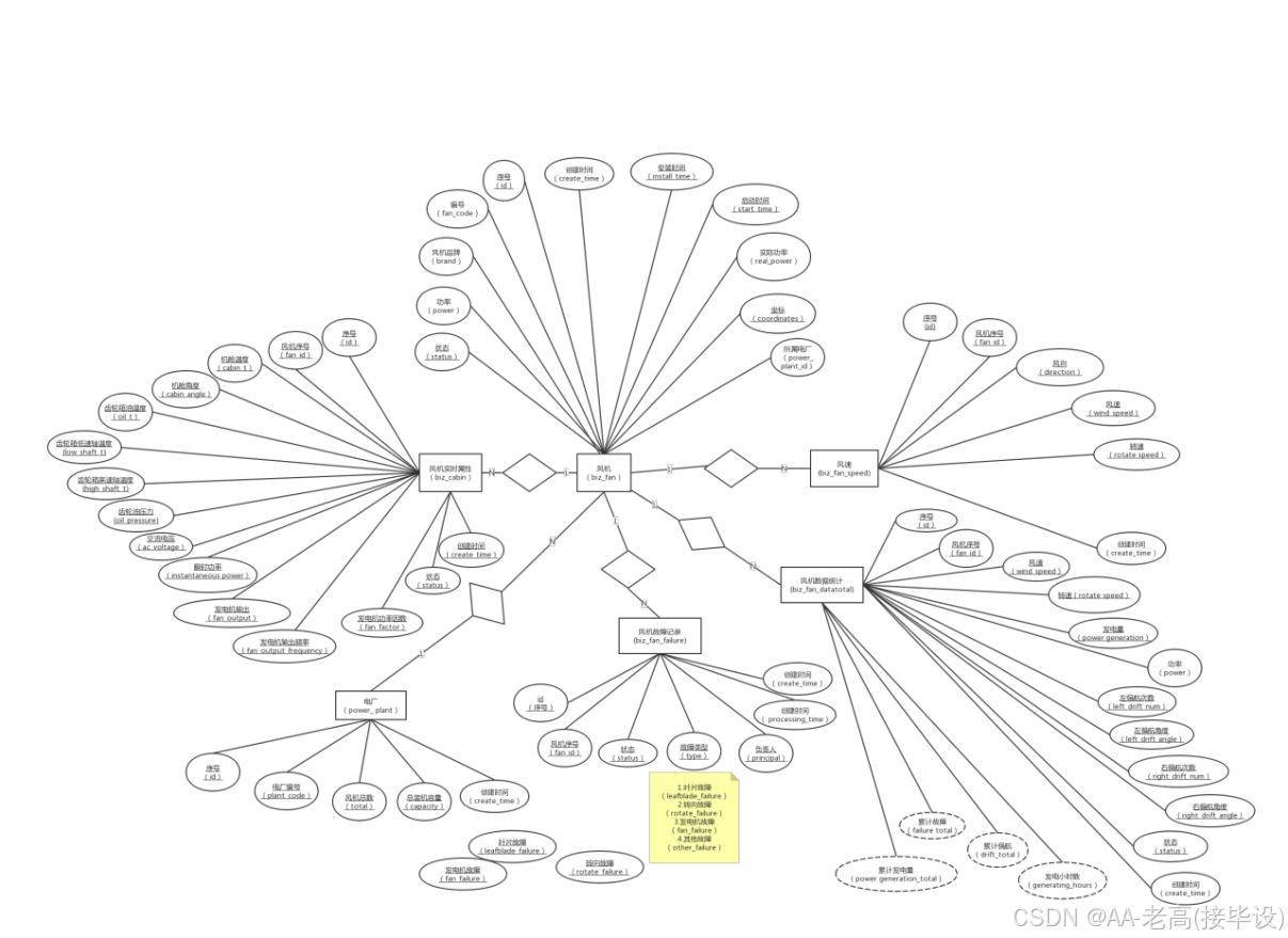 风机编号、风机品牌、功率、实际功率、所在位置(坐标),所属电厂、启动时间、安装时间、运行状态等。